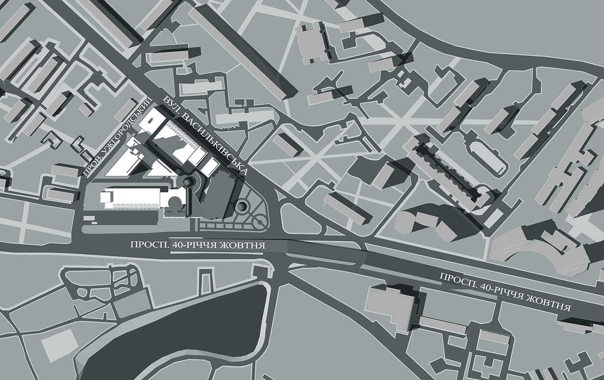 Архитектор Юрий Бородкин.    Концепция застройки квартала, ограниценном улицой Васильковской, перулком Ужгородским и проспектом 40-летия Октября в городе Киеве.