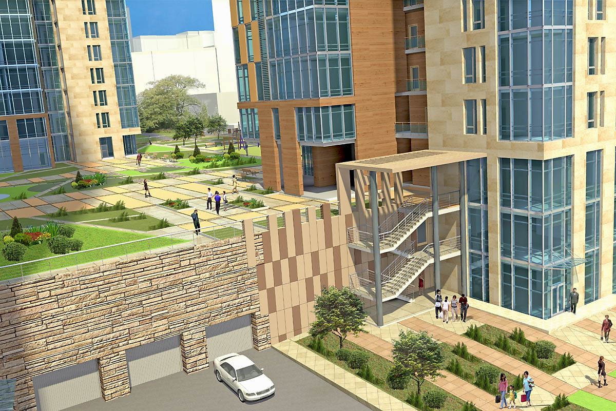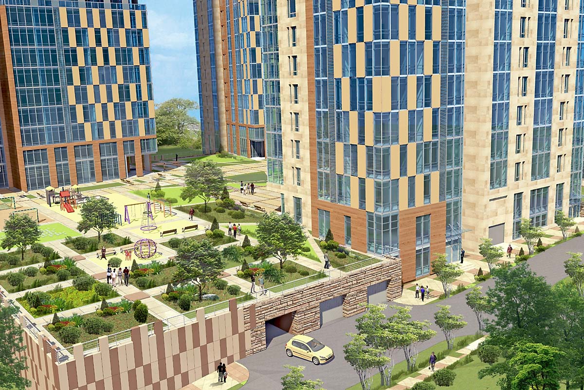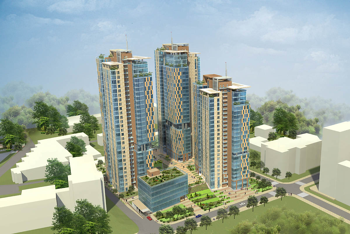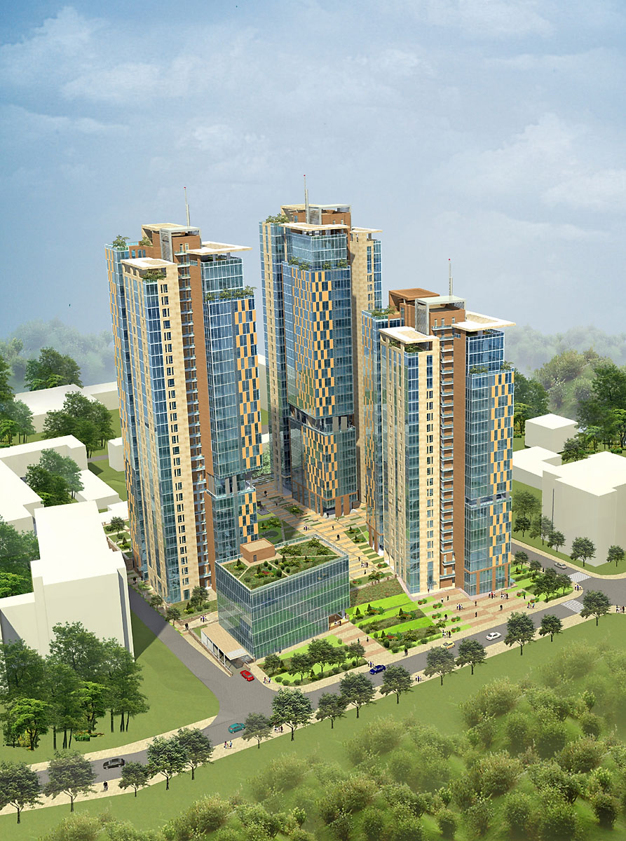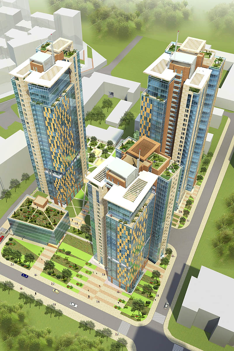 Проект жилищно-административного комплекса со встроенно-пристроенными помещениями общественного и торгового назначения с надземным и подземным паркингом по улице Анри Барбюса 39/2. Печерский район города Киева Авторский коллектив: гл. спец. архитектор С. Рыченкова, архитектор А. Левко, архитектор Е. Антипова |