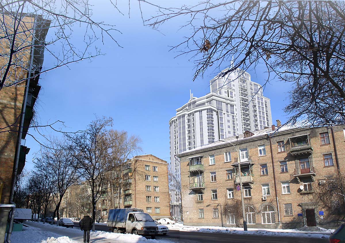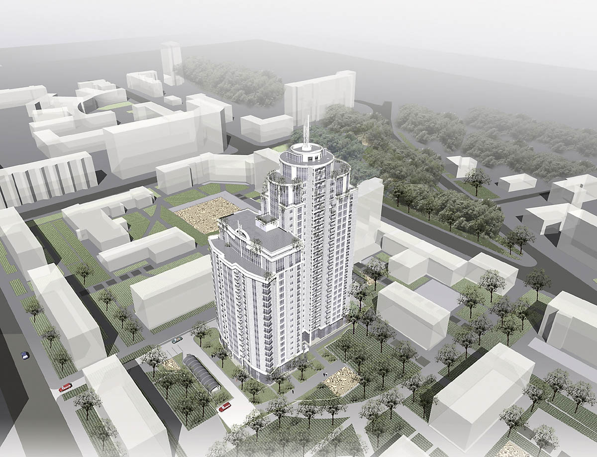 Проект многоэтажного жилого дома со встроенно-пристроенными помещениями общественного назначения и подземным паркингом по ул. Белорусская,36,а. Шевченковский район города Киева Авторский коллектив: гл. спец. архитектор С. Рыченкова, архитектор С. Радаловская, рук. гр. арх. Н. Залевская |