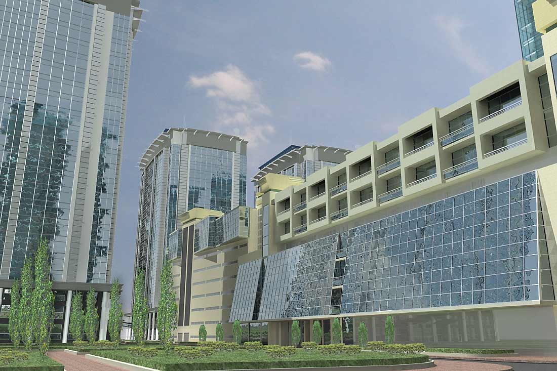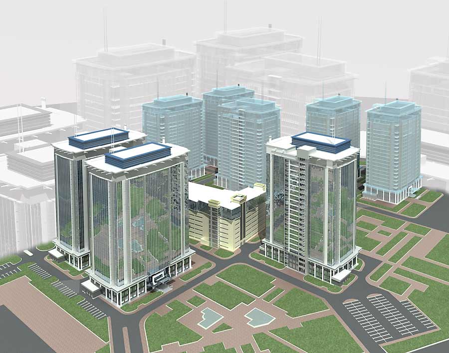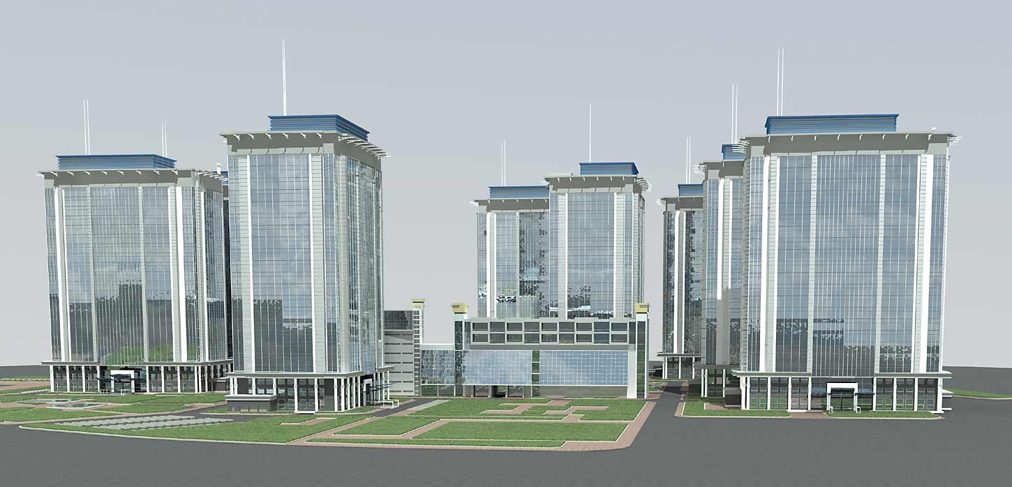 Проект предусматривает строительство трёх одинаковых зданий. В двух зданиях на первых этажах предусмотрены встроенные торговые помещения на продуктовые группы товаров. Паркинг представлен девятиэтажным зданием. |