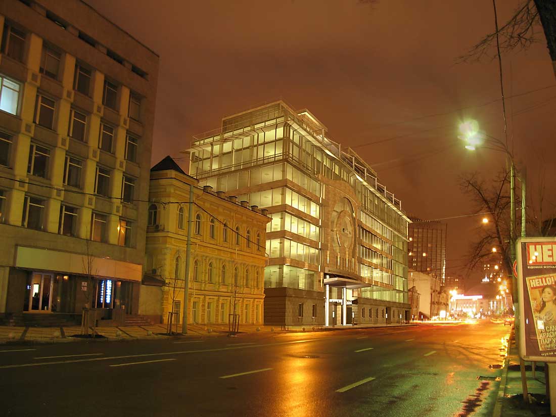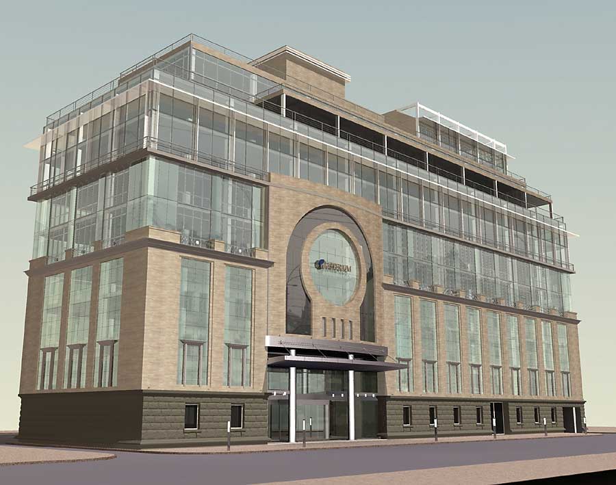 Технико-экономические показатели: - площадь участка 0,32 га - площадь застройки 2100 кв. м - количество этажей 8-12 - общая площадь 25200 кв. м - площадь административных помещений 16450 кв. м - количество мест для парковки автомобилей 75 |