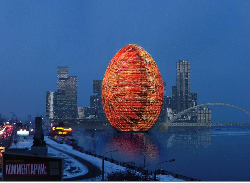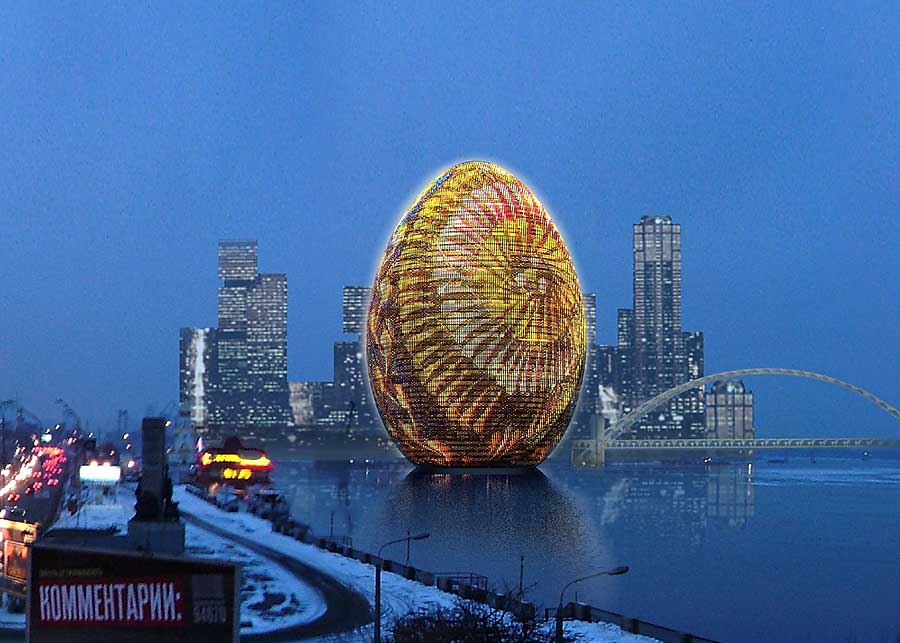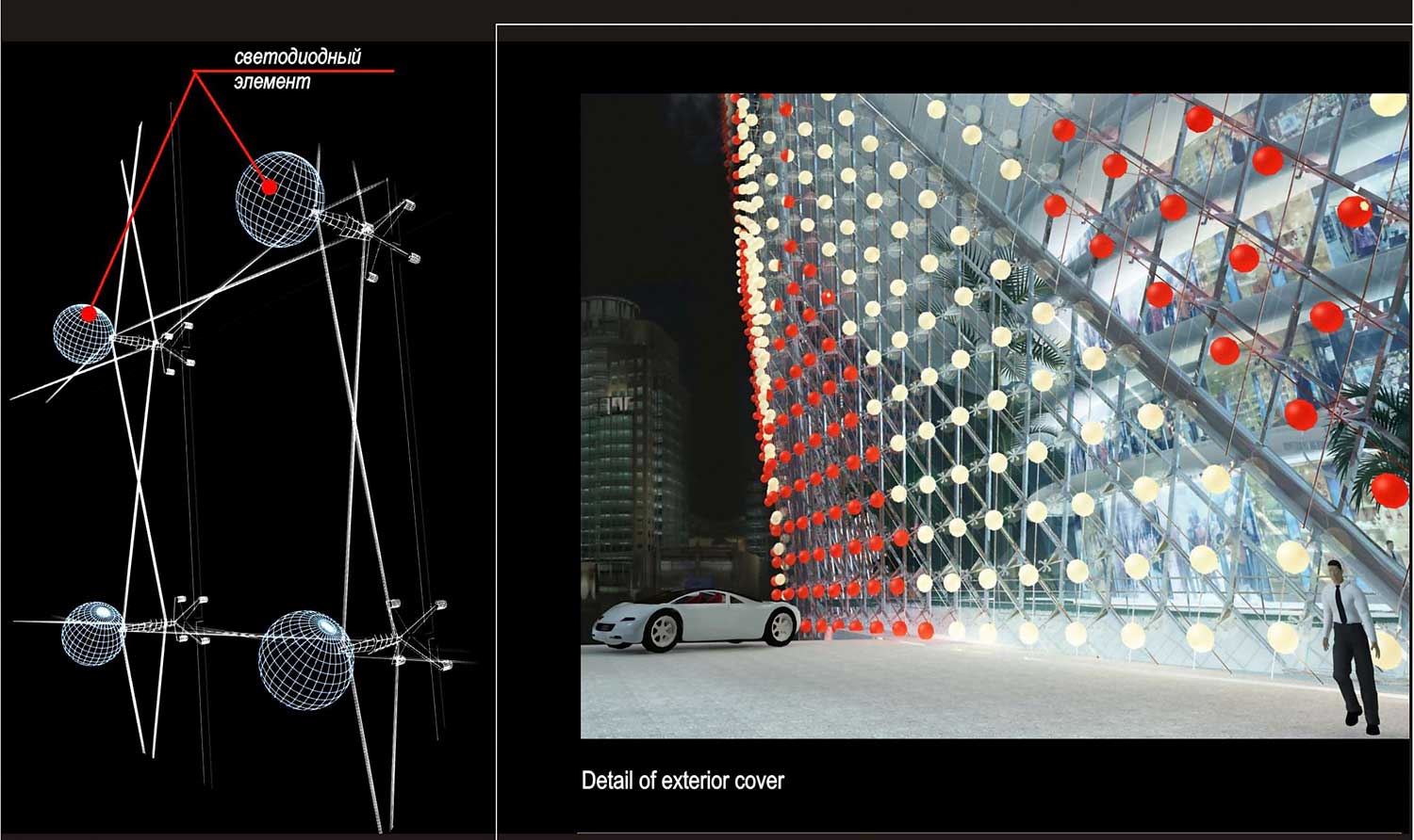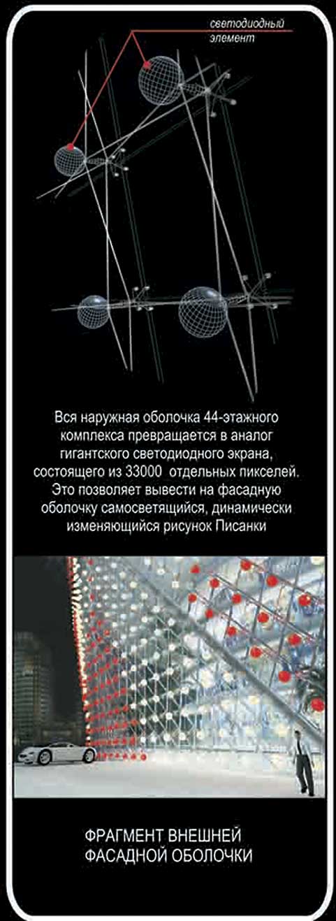 Это позволяет вывести на фасадную оболочку самосветящийся, динамически изменяющийся рисунок Писанки.
