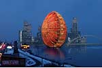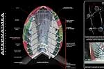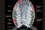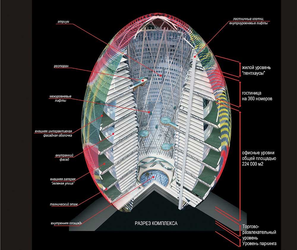 Выше уровня площади располагается основной объем – 44-этажное здание в форме яйца.