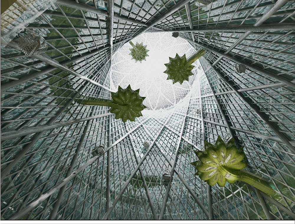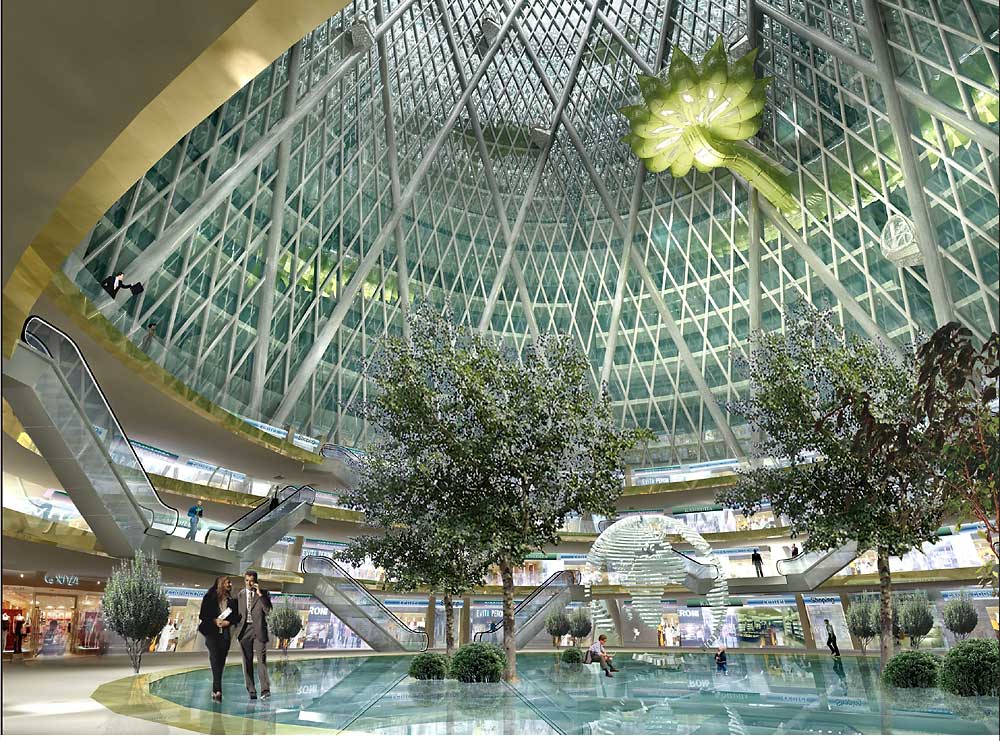 По периметру уровней предусмотрены остекленные озелененные рекреационные галереи, являющиеся также буферной зоной между наружным пространством и внутренними помещениями комплекса.