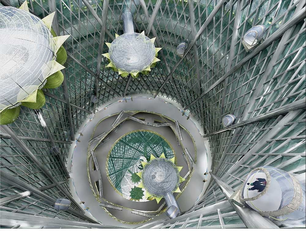 Внутрь пустого внутреннего пространства светового колодца консольно выходят расположенные на разных уровнях «Подсолнухи» - рестораны. Кольцом вокруг атриума расположены 37 полезных этажей комплекса, которые разделяются на 8 уровней техническими этажами.