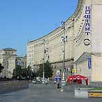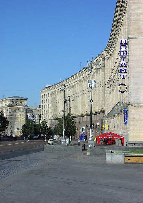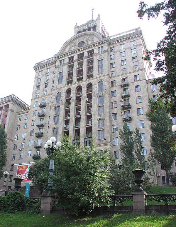 Первые после войны жилые дома были построены в 1950-1951 гг. на Крещатике, 13 и 17 (архитекторы А.В.Власов, А.В.Добровольский, Б.И.Приймак – Ред.). Разрыв между зданиями оформлен огромной аркой, соединяющей оба корпуса пассажа. По сторонам арки были установлены скульптурные группы. К сожалению, сегодня их уже нет. Мне говорят, что скульптуры отвезли на реставрацию. Но эта реставрация длится уже более десяти лет. Я понимаю, что скульптурная композиция просто уничтожена, но сегодня это никого не волнует…