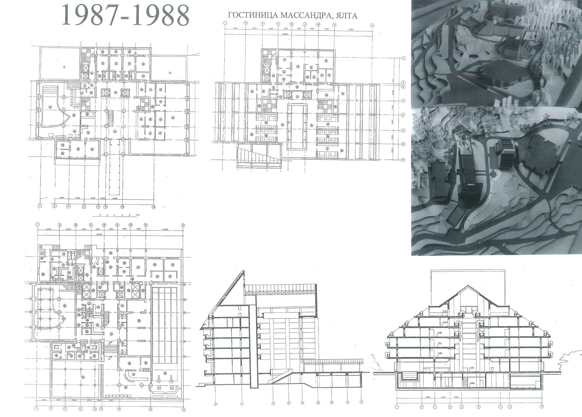 1977-1978 годы. Проект гостиничного комплекса евро класса на месте двух старых зданий гостиницы «Массандра». Проект рассмотрен, согласован руководством города. Автор с архитектором Миргородским А.С. |