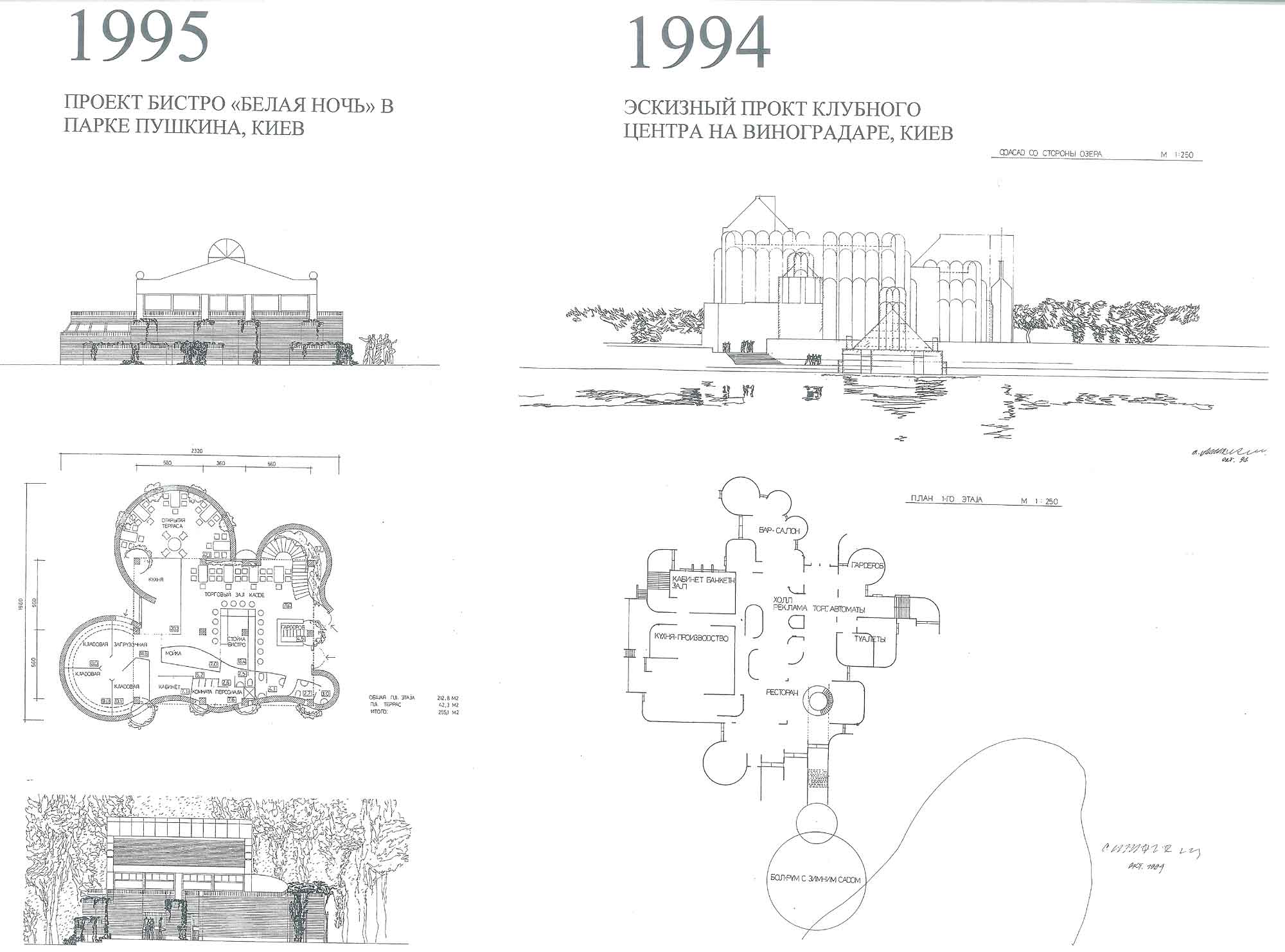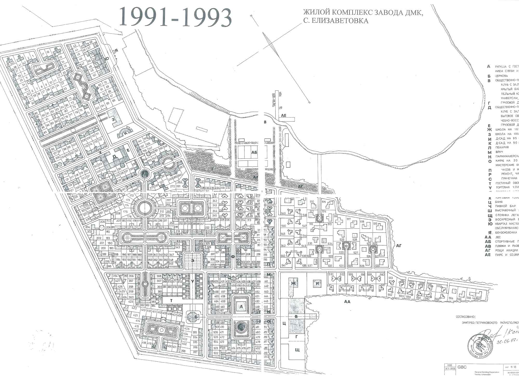 1991-1993 годы. Проект жилого комплекса Днепродзержинского металлургического комбината в п. Елизаветовка (450 жилых коттеджей и таунхаусов) в конструкциях «Пластбау», Швейцария. Подрядчик -Югославская строительная компания. Строительство закончено в 1998 -2000 гг. Автор с коллективом