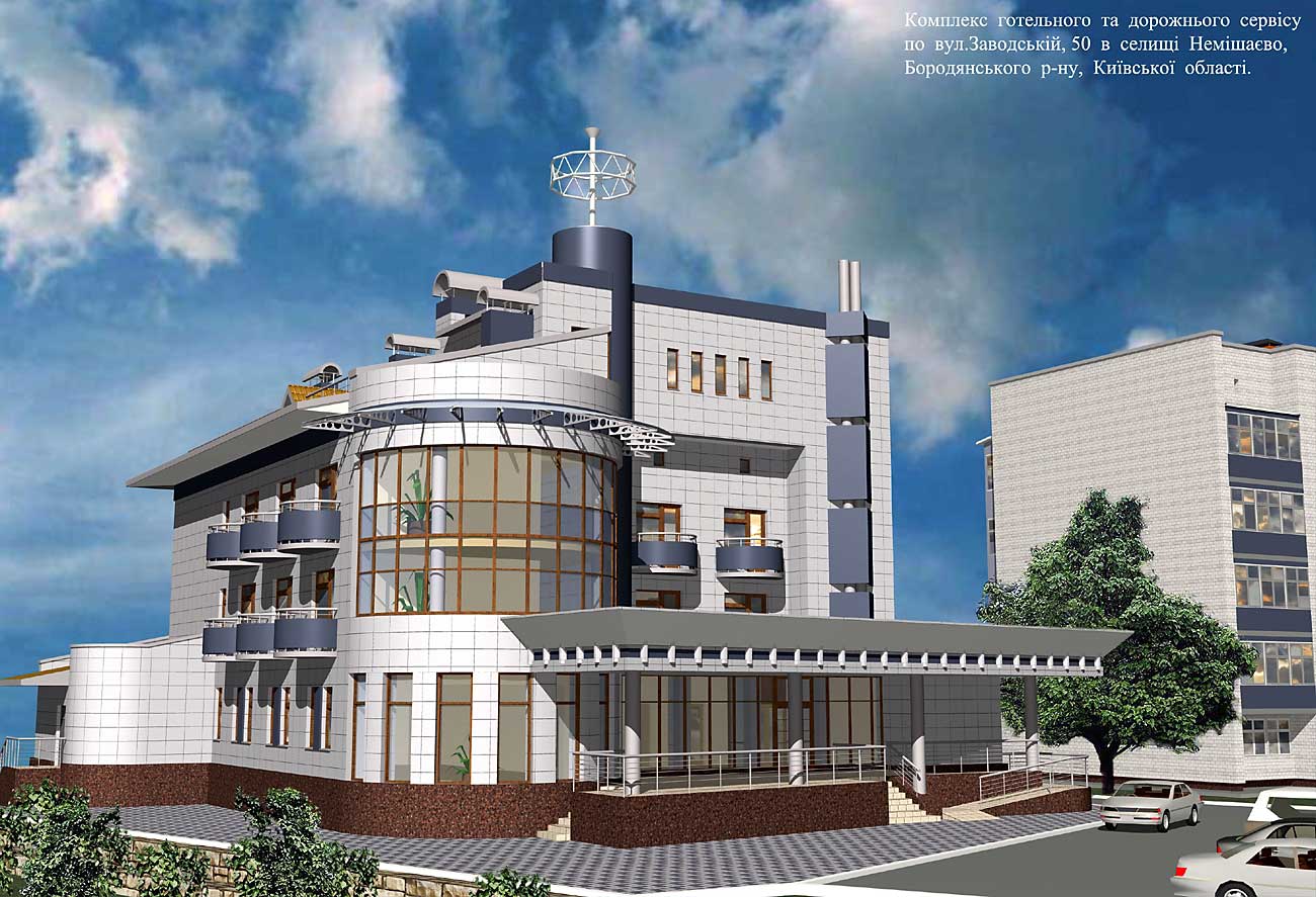 Архитектор Андрей Гончаров. Проект комплекса гостиничного и дорожного сервиса в посёлке Немишаево. Бородянский район, Киевская область.