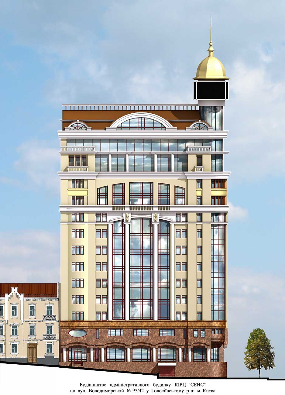 Архитектор Андрей Гончаров. Главный фасад административного здания КИРЦ «СЕНС» по улице Владимирской 94/42 в Голосеевском районе города Киева.