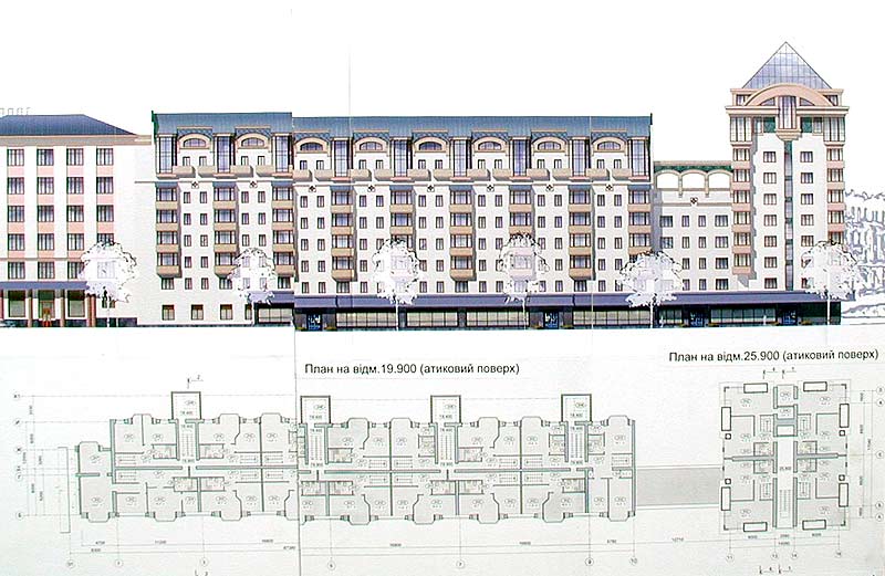 Авторы проекта считают, что после получения разрешения на реконструкцию дома, находящегося напротив, на противоположной стороне проспекта Победы (в настоящее время этим и занимается заказчик), реконструкция вернёт им утраченный образ пропилеев этой центральной киевской магистрали. Проведённые исследования показали, что основные объёмы могут быть надстроены лёгкими конструкциями. Предполагается надстроить жилые помещения для 40 человек. Мнения членов Совета были чрезвычайно разнообразны: Г. Духовичный: Участок не то, что морально устарел, а просто умер и его не реанимировать, а снести надо и проектировать новое начало проспекта. О. Лелека: Жилой фонд этот ниже среднего уровня и поддерживать его реконструкциями не стоит. Е. Лишанский: Это хорошая архитектура 1960-х годов и мы были в восторге от этих домов, когда они появились вместо базара. Из-за экологической ситуации здесь не получится элитное жильё. Я бы не стал эти дома изменять, а перевёл бы в общественные здания.