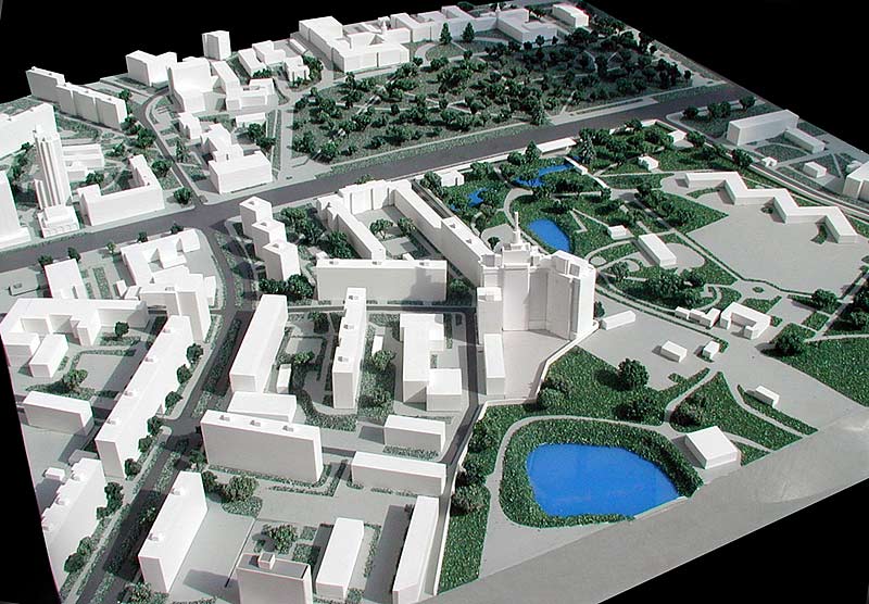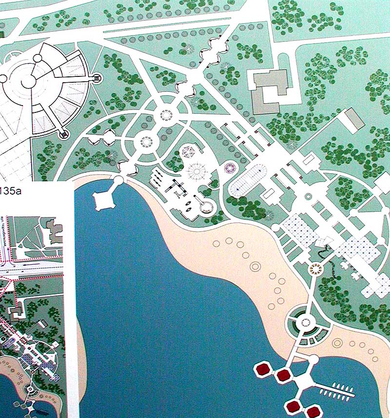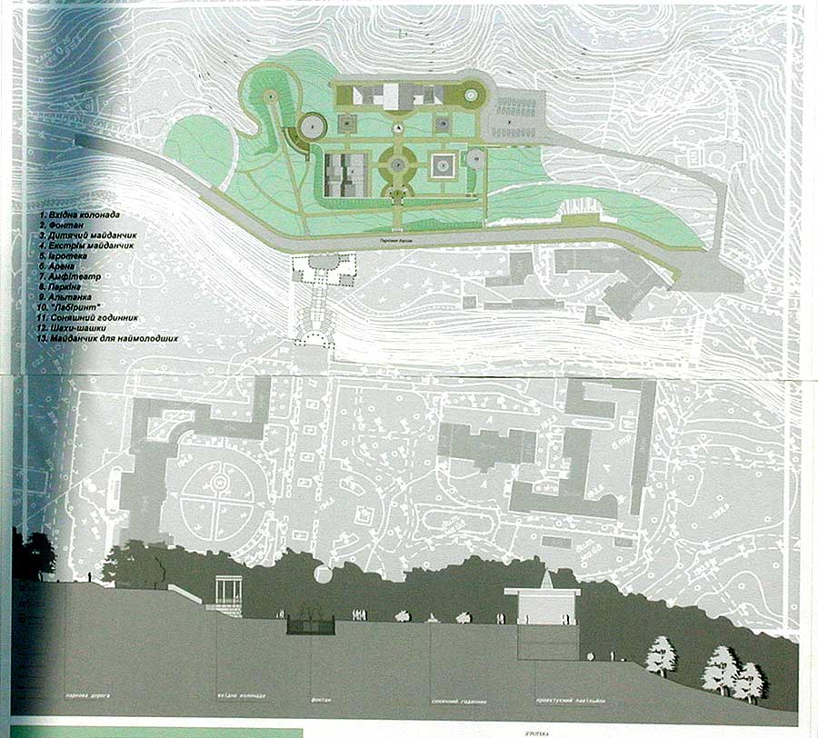 Для создания инфраструктуры парка выделено 20 га. Особенностью участка является наличие 40-метровго коридора, занятого электро и инженерными сетями. Планируется, что 80% территории займёт основная парковая зона с пляжем, детской и спортивной площадками, кафе, кинотеатром, боулингом, интернет-кафе. Всё это осуществляется за счёт торгового комплекса, под которым по оси озеленения разместится и автостоянка. О. Лелека: Хорошая работа – сделана мягко, красиво, в ней есть душа. Но хотелось бы видеть более развитую спортивную зону. Ведущий Совет Э. Лещенко: необходимо градостроительное обоснование и решение Киевсовета по перепрофилированию территории. Как идею одобряем – работайте дальше. |