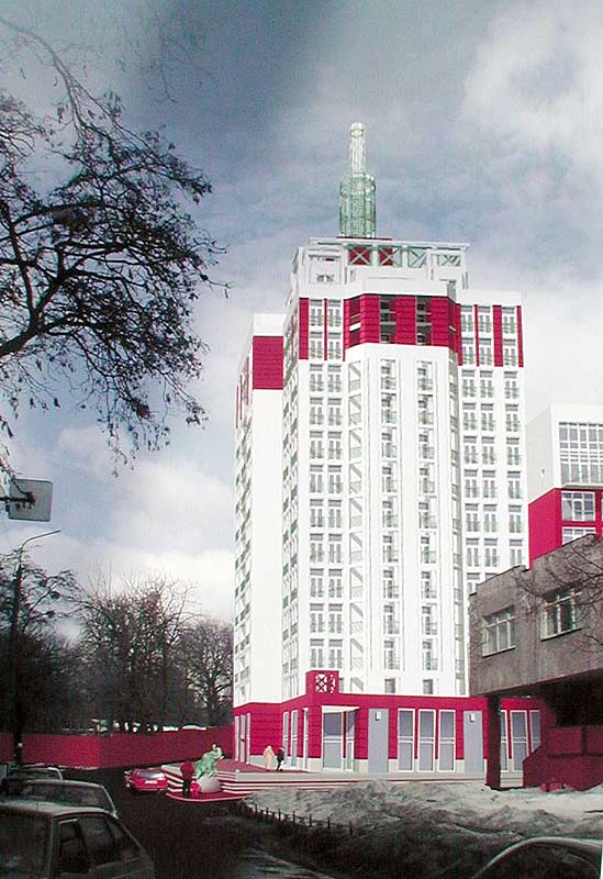 Здание высотой в 23 этажа на 128 квартир. Паркинг на 94 автомобиля и стоянка полностью покрывают потребность в парковочных местах. Рядом лесопарковая зона. Ведущий Совет Э. Лещенко: сам по себе дом может быть, но надо показать развитие этой территории. Заказчик и автор должны предоставить транспортную схему и сделать макет для выяснения общей градостроительной ситуации и доказательства правильности посадки.