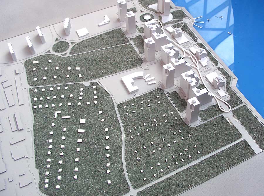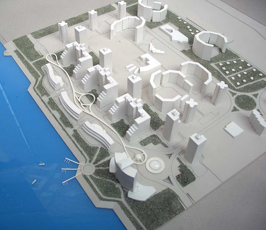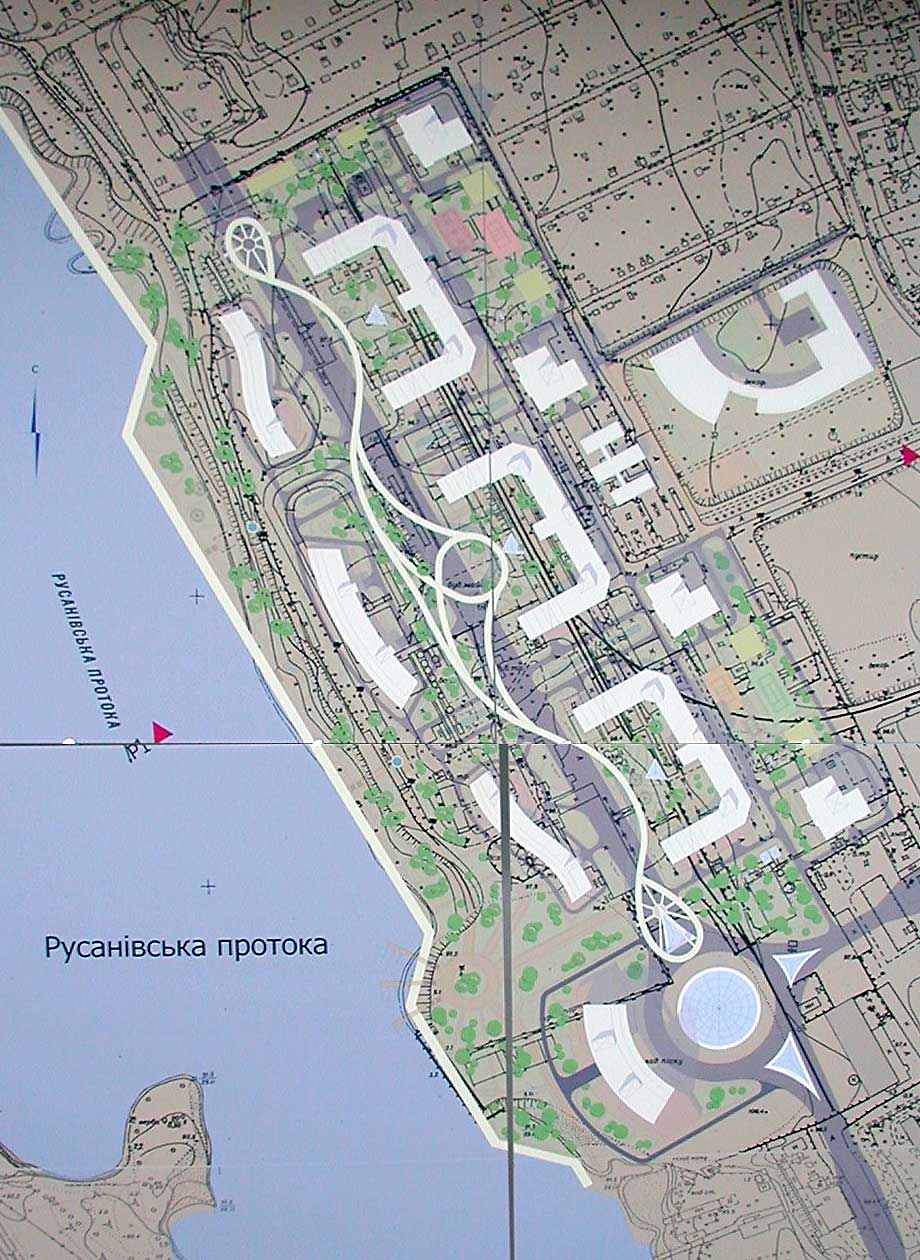 Эскиз создан на основе ДПТ, разработанного Киевпроектом. Участок площадью 21,51 га (бывший Дарницкий комбинат), ограничен Русановским заливом, Садами и высотной застройкой. Здесь авторы планируют повышение уровня до точки незатопляемости и предлагают построить жилищный комплекс с социальной инфраструктурой и торговыми точками. Предполагается строительство 11 жилых домов (высотой в 8-12-25-30 этажей) на 3500 квартир общей площадью 500 тысяч кв. м., двухуровневого подземного паркинга, необходимых по рассчётам школы на 1600 учеников и детсада на 280 мест, и в первых этажах будут размещены группы временного пребывания детей на 120 мест. Организация основного транспортного потока под землёй даст уникальную для Киева возможность слияния жилья с большой и комфортной рекреационной зоной.