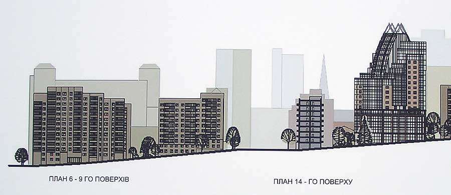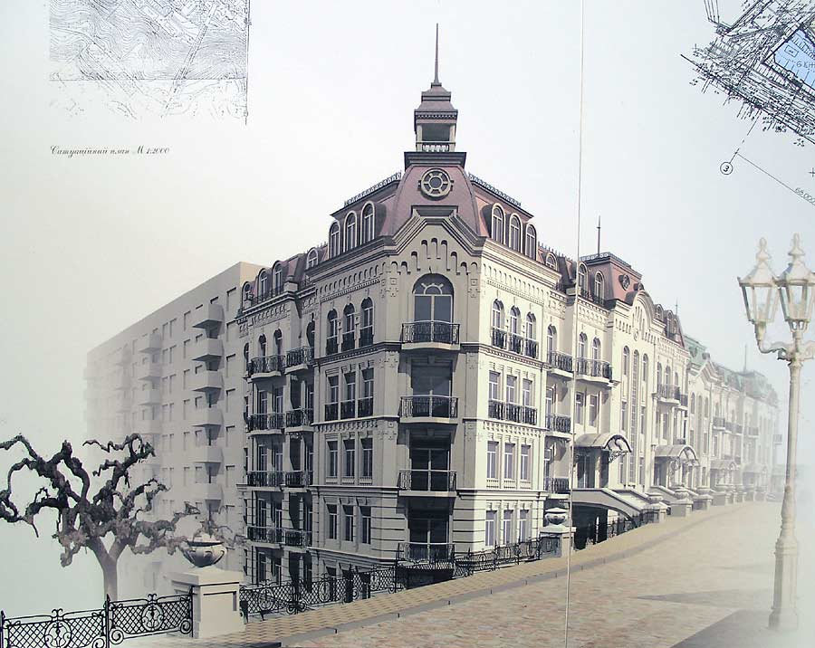На свободном от застройки участке площадью 2649 кв. м. авторы планируют посадку 3-хсекционного дома, который, по их мнению, соответствуя стилю исторической застройки Подола и логично продолжая застройку улицы, позволит планировочно завершить квартал.