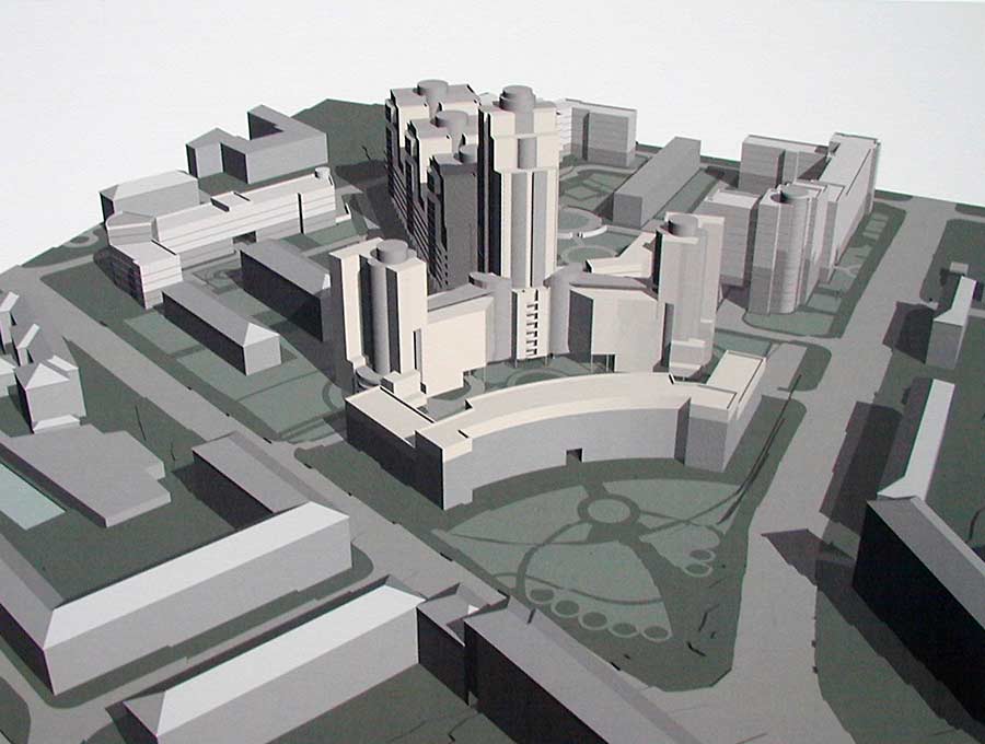 Первоочередной же задачей для авторов является строительство офисно-жилого комплекса с пристроенными помещениями под офисы и торгово-развлекательным учреждением на пересечении улиц Павловской и Златоустовской (на месте бывшей табачной фабрики). Его проект рассматривался отдельно.