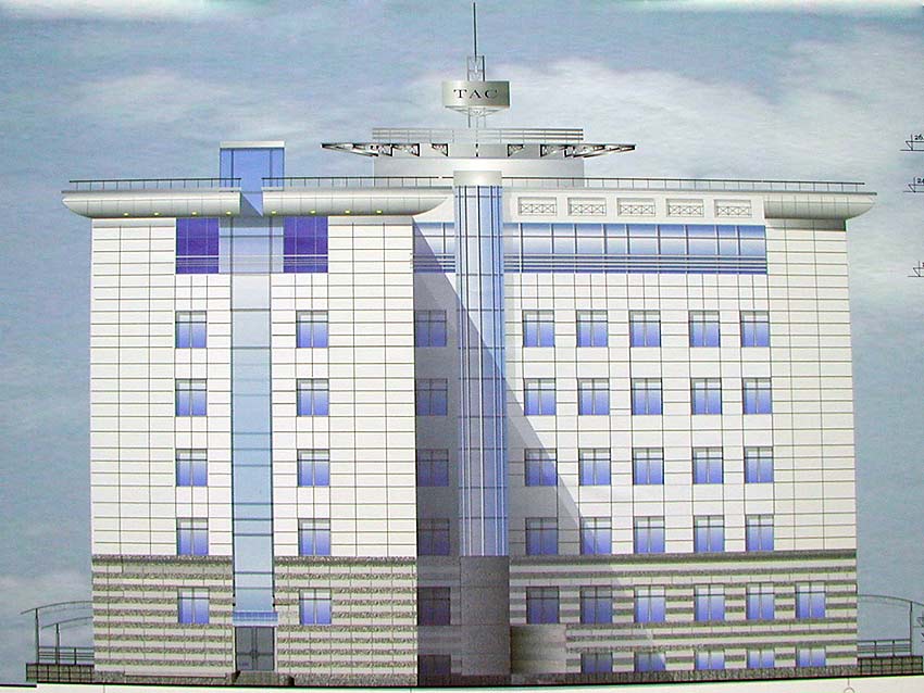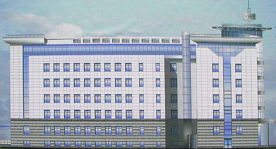 Уже 15 – 20 лет назад эта площадка была в проектном обороте. Необходимость как-то закрыть неэстетичный торец актуальна и сегодня. Авторы показали два варианта 6-7-этажной пристройки офисного назначения общей площадью 9052,4 кв. м. с подземным паркингом на 36 мест. Пристройку рассчитывали объединить под карниз с существующим зданием, но подготовили и более высокий вариант. На нижних этажах могут расположиться торговые помещения. По мнению авторов, избранная архитектурная форма соответствует архитектуре церкви Рождества. Эта работа – поисковая.