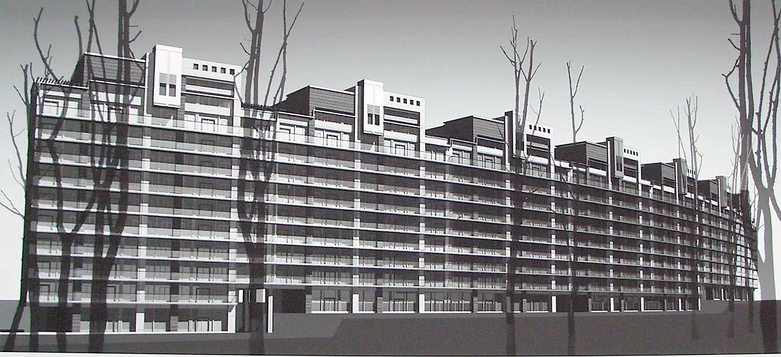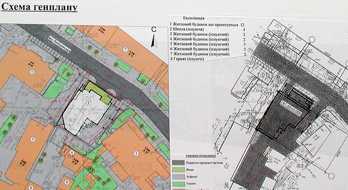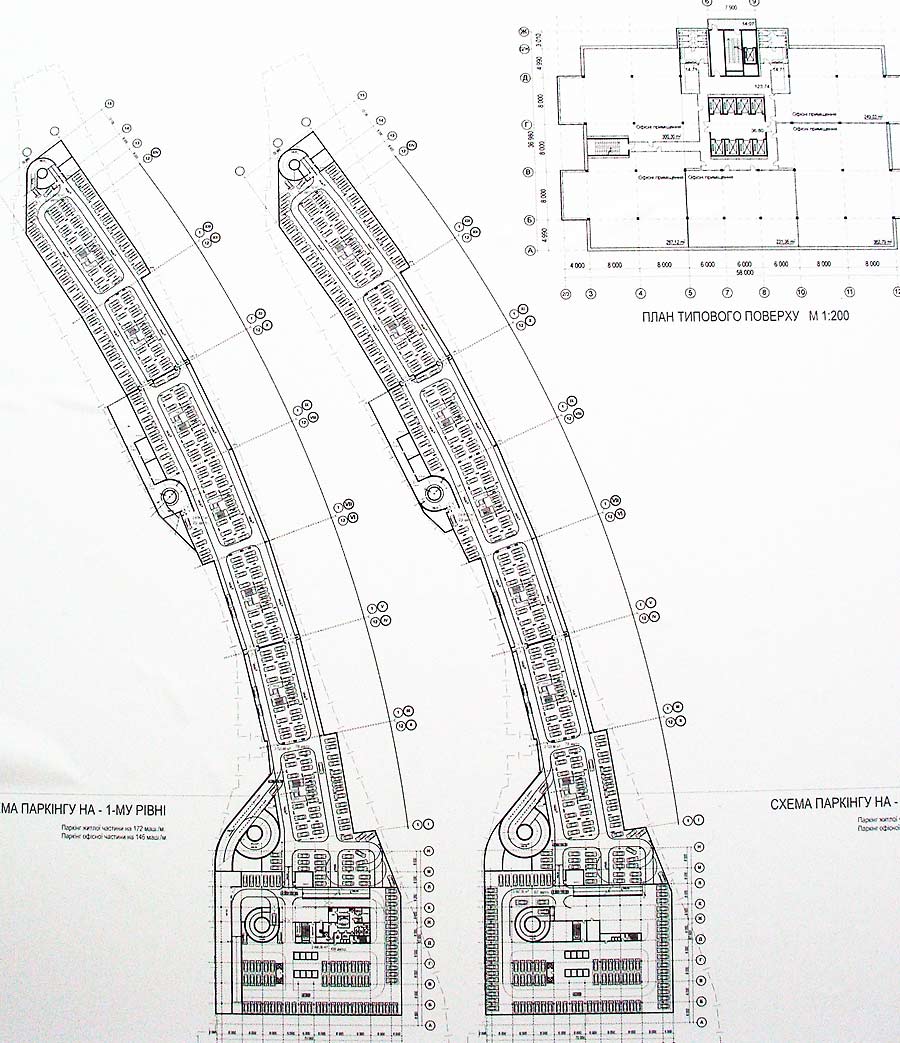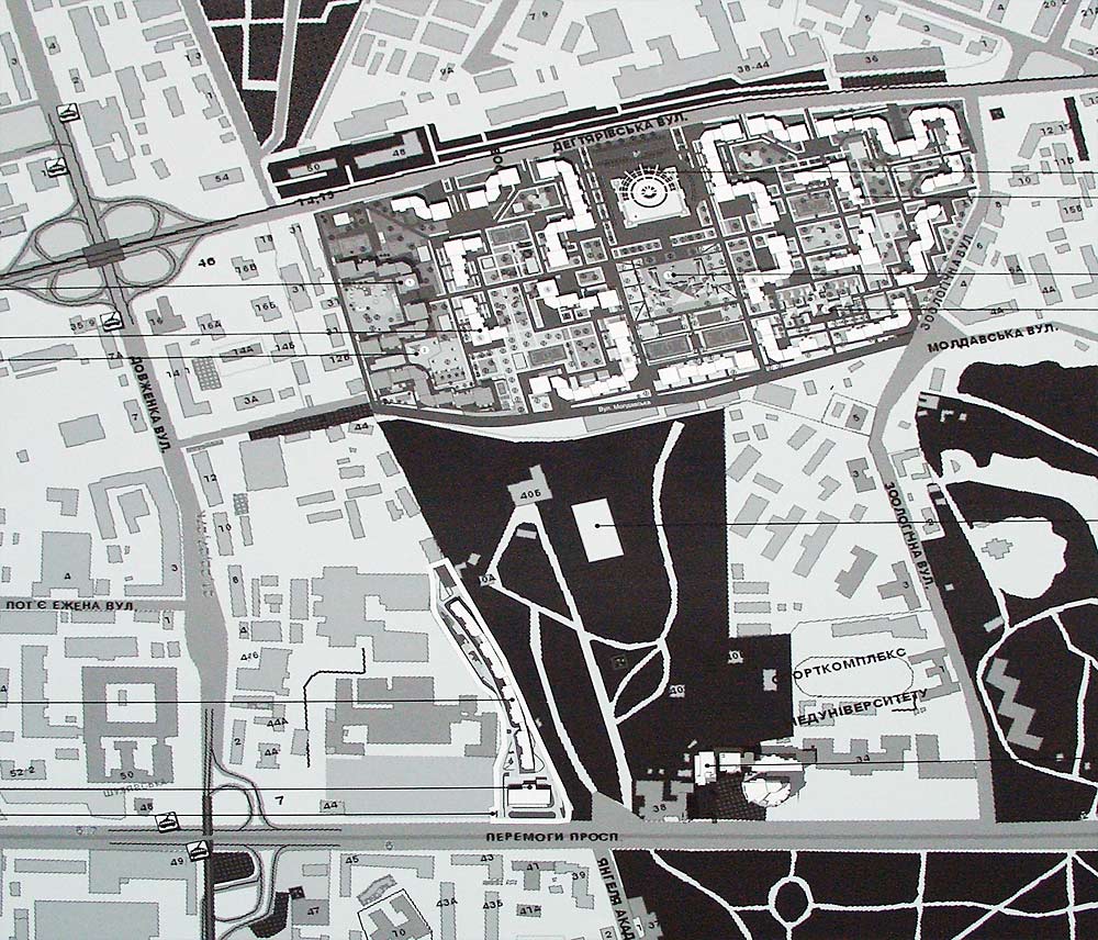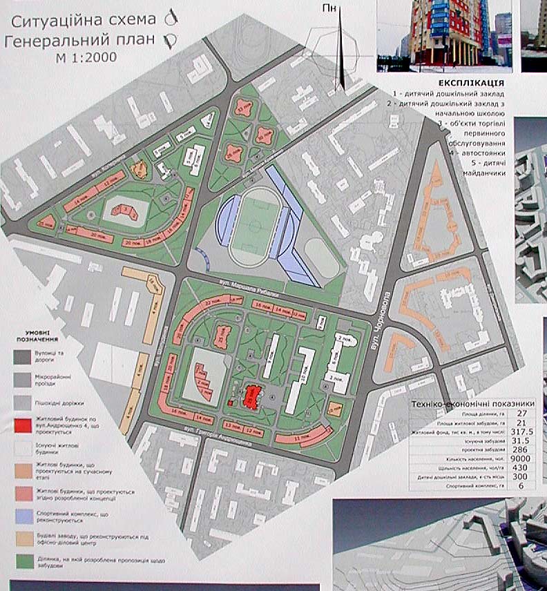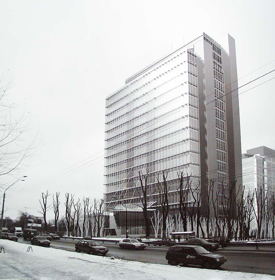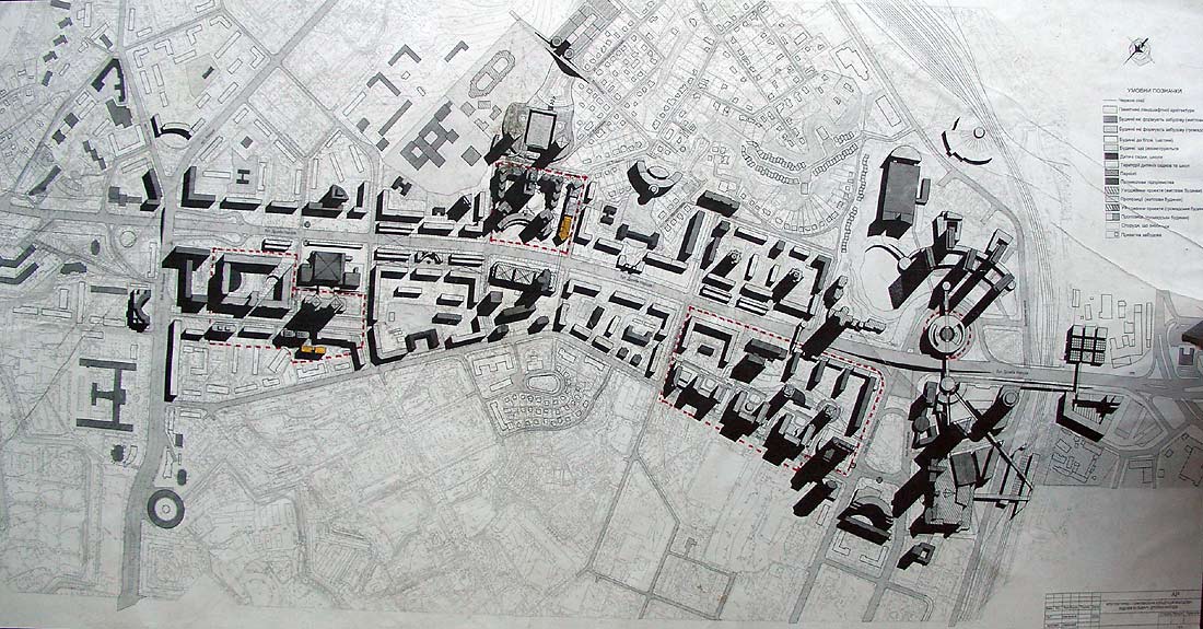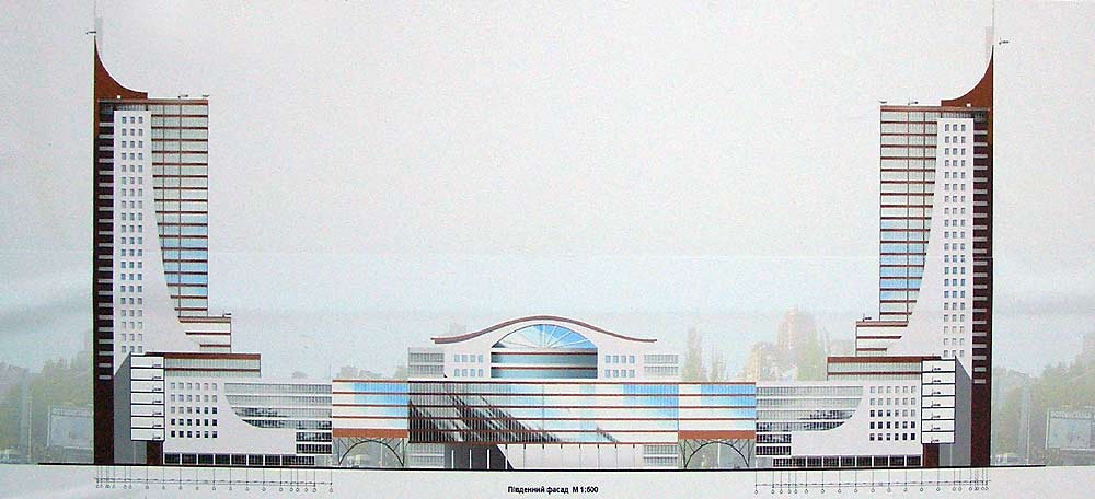 На предыдущем рассмотренни, Совет принципиально поддержал высотный объём, выходящий на проспект Победы, и низкий со стороны территории киностудии. Учитывая экологическую ситуацию, теперь здесь проектируется офисно-жилой комплекс (все документы получены). На первом этаже предусмотрен объект общественного питания. Решена транспортная схема с въездом-выездом в подземный паркинг. Сделан эскиз памятника А. Довженко (скульпторы В. Щур и В. Сивко).