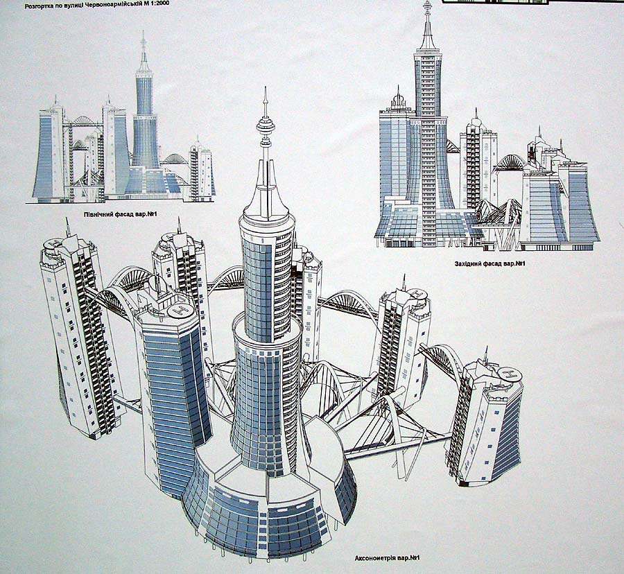 Л. Скорик: Это место давно требует гуманизации. Без жилья здесь нельзя. Оно должно быть наименьшим по ёмкости, но должно присутствовать. Тут можно позволить высоту и в 50 и в 60 этажей. Надо найти соотношение между горизонталным и вертикальным. Я против россыпи вертикалей, которые показаны в обоих вариантах. Должна быть одна локализация высоты.