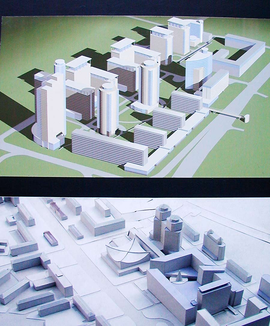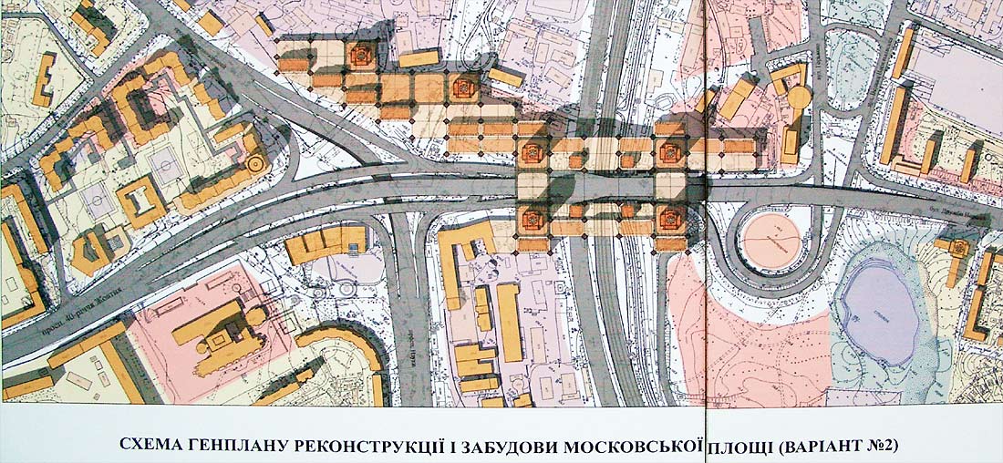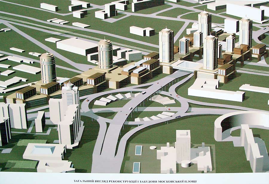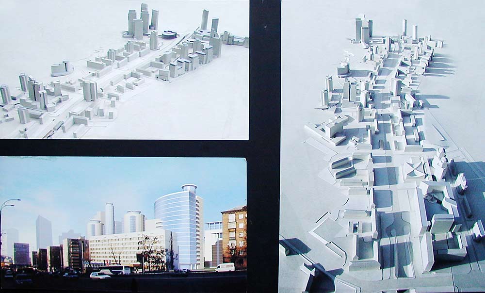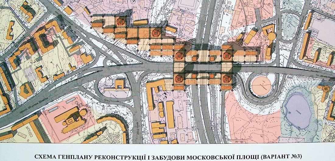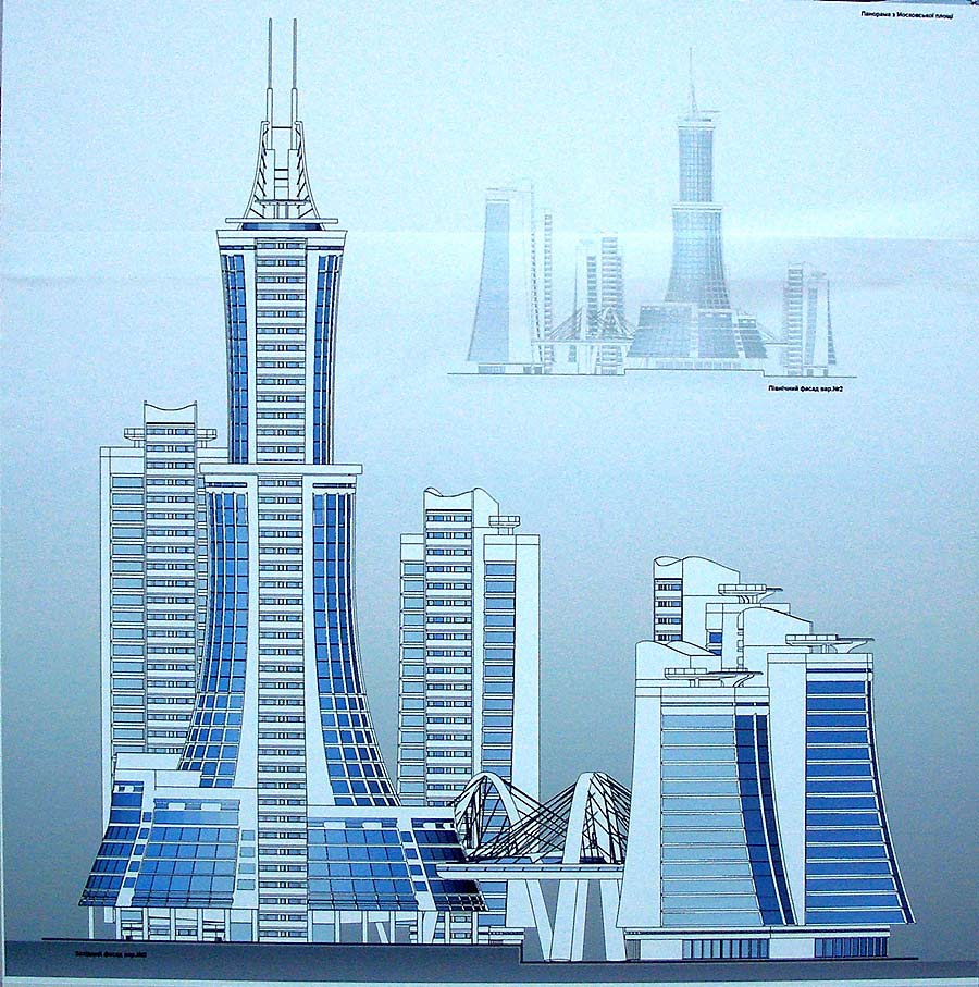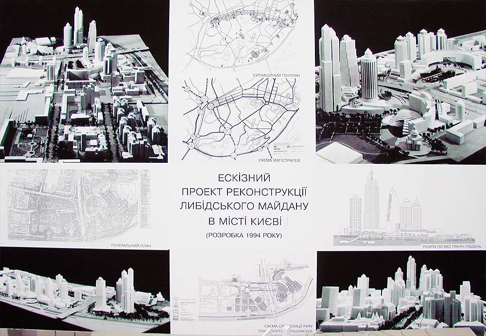 И. Шпара: Мы рассматривали комплексно две площади Лыбидскую и Московскую. Обратите внимание на работу 1994 года. Тогда появился инвестор для торгово-офисного-развлекательного центра и профинансировал эту разработку. Была пересмотрена транспортная схема, убиралось кольцо, развязка решалась в разных уровнях, здания доходили до высоты в 50 этажей. Тогда этот проект не был принят. Сейчас мы предлагаем разделить площадь на две части.