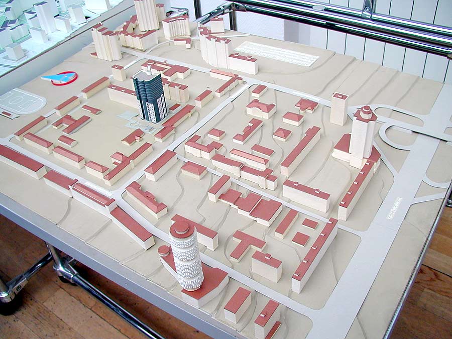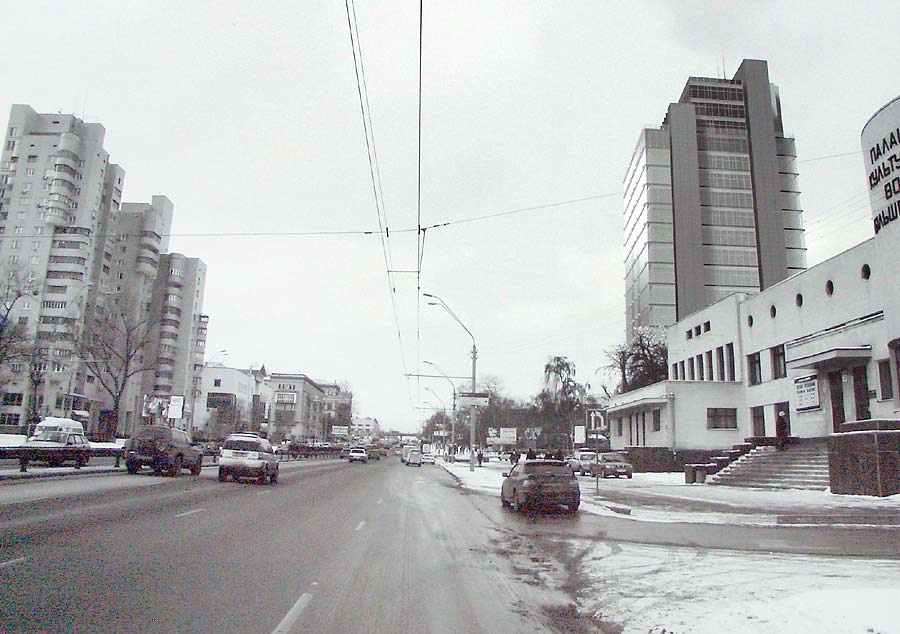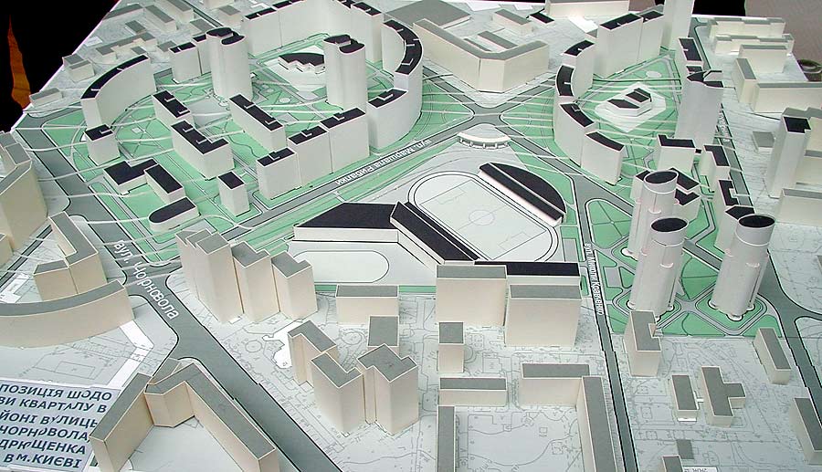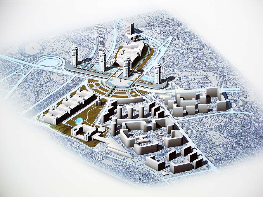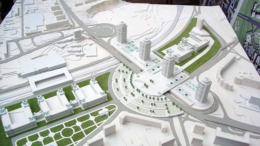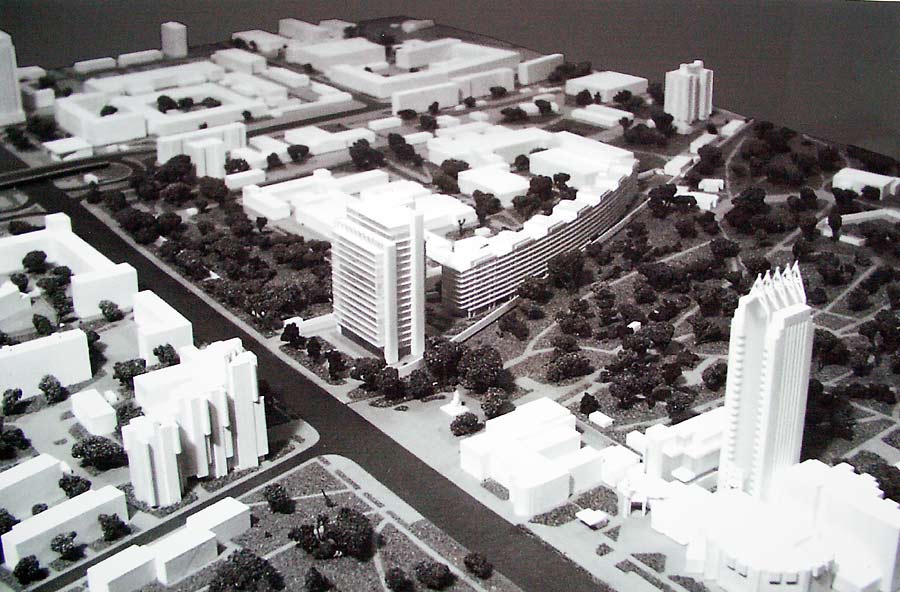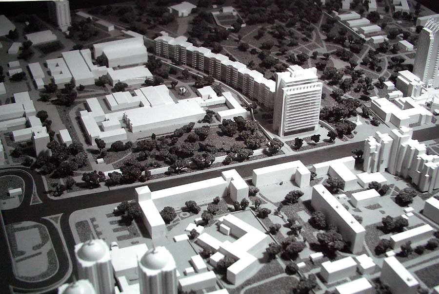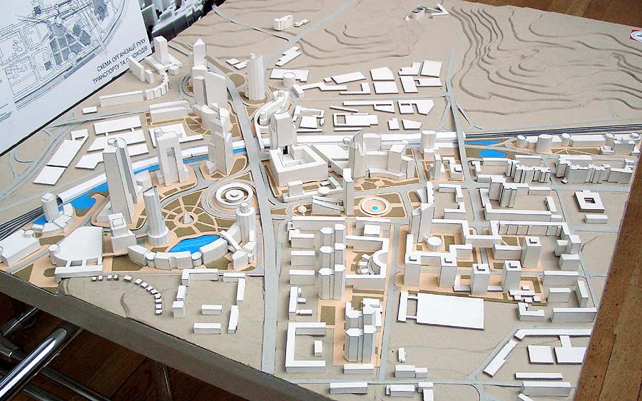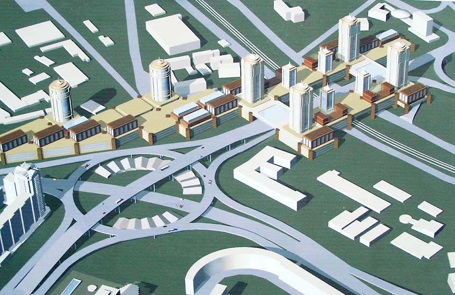 И. Шпара: Мы рассматривали комплексно две площади Лыбидскую и Московскую. Обратите внимание на работу 1994 года. Тогда появился инвестор для торгово-офисного-развлекательного центра и профинансировал эту разработку. Была пересмотрена транспортная схема, убиралось кольцо, развязка решалась в разных уровнях, здания доходили до высоты в 50 этажей. Тогда этот проект не был принят. Сейчас мы предлагаем разделить площадь на две части.