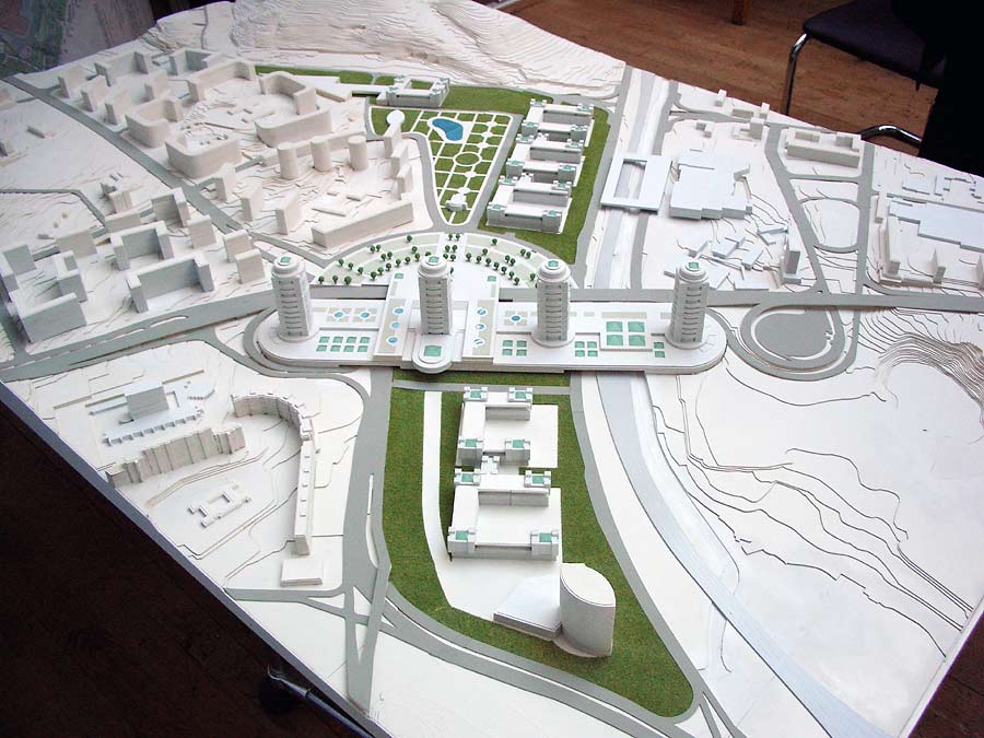 В. Ежов: Основная задача – определить тип площади, её параметры, тип зданий, которые здесь могут быть построены. Это нагруженная транспортом площадь, одна из основных в городе. Площадь на грани въезда в город, здесь заканчивается исторический центр. Мы рискнули на повышенную этажность. Главное здание торгово-офисного типа, может «оседлать» транспортные пути, – бульвар Дружбы Народов. Возле озера предлагаем зелёную зону с аквапарком.