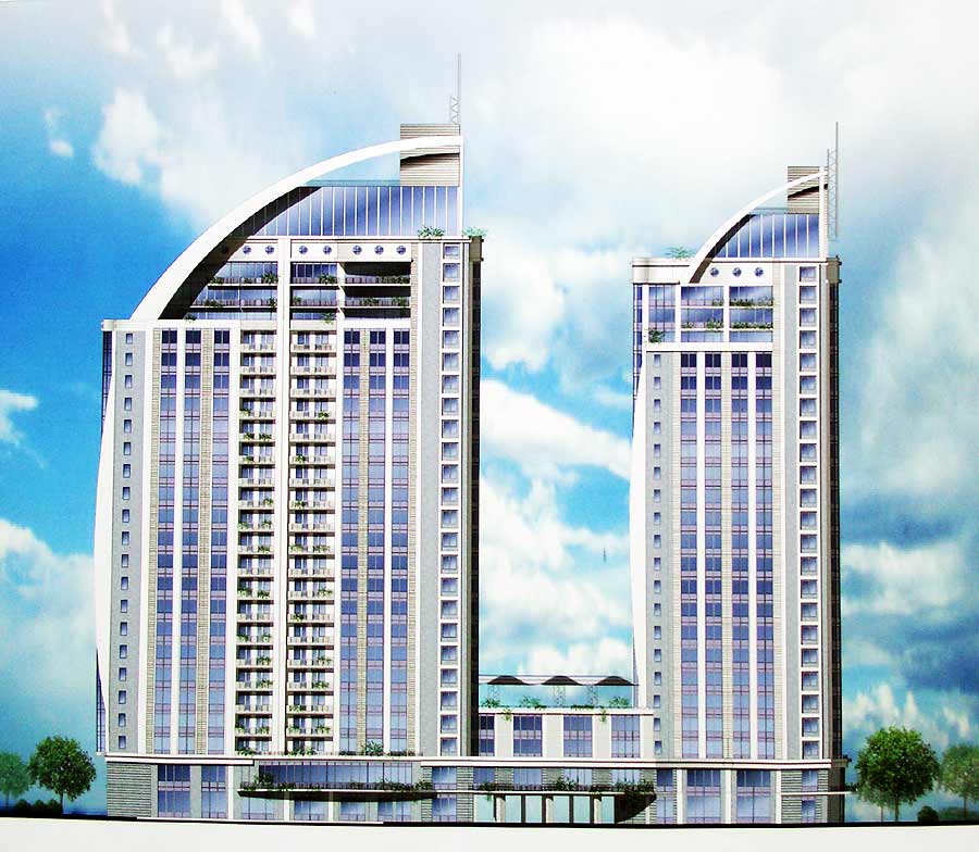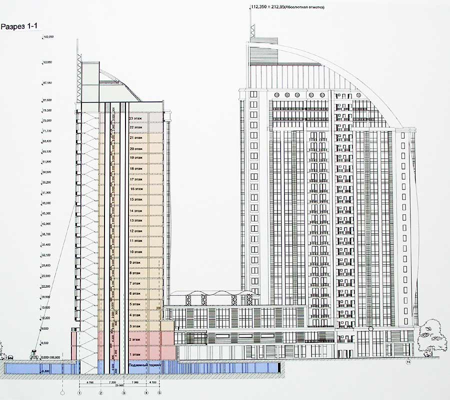 Площадь участка 0.93га. Площадь застройки 2997.5 кв. м. Количество квартир 277. Количество этажей 23, 24.