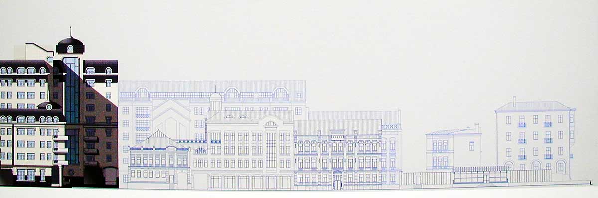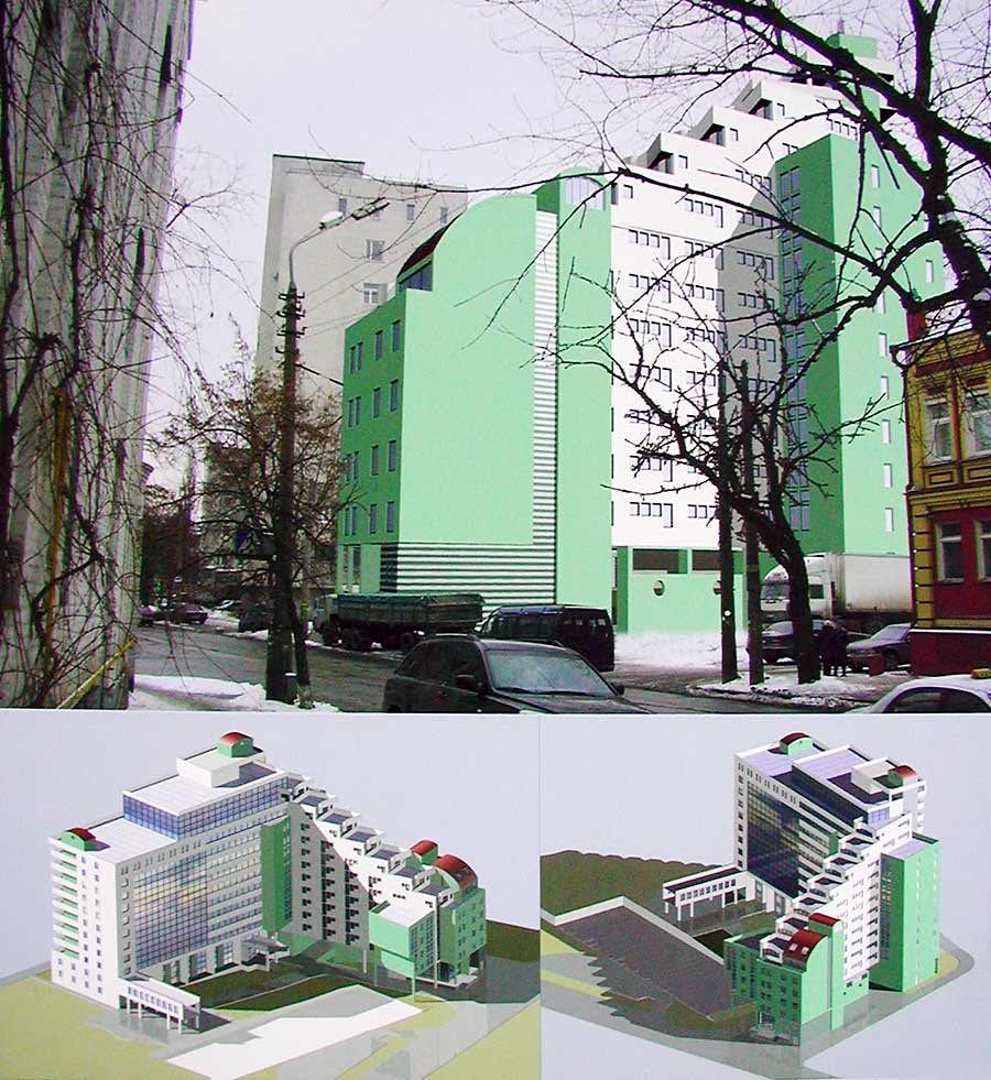 Первый вариант пристройки к существующему 9-этажному корпусу решался с учётом системы старых красных линий, которые сейчас отменены. Первое решение было пересмотрено и теперь предлагается новый вариант пристройки офисного назначения.