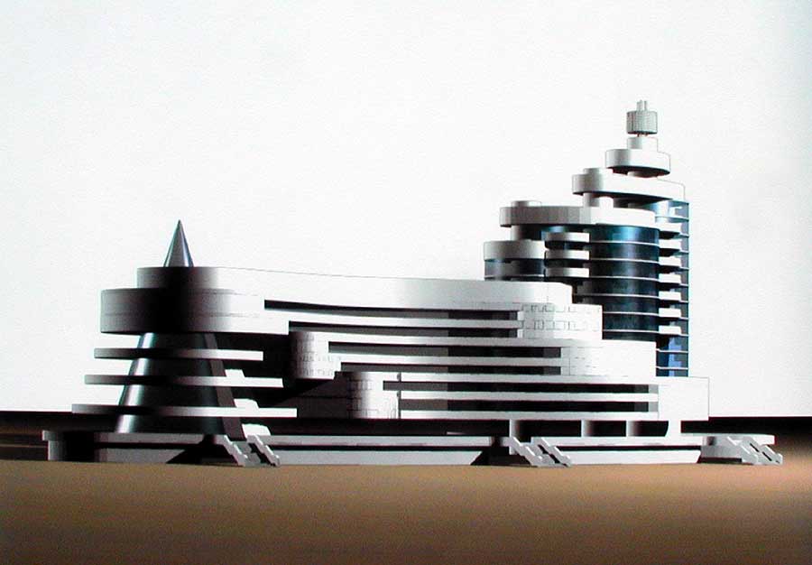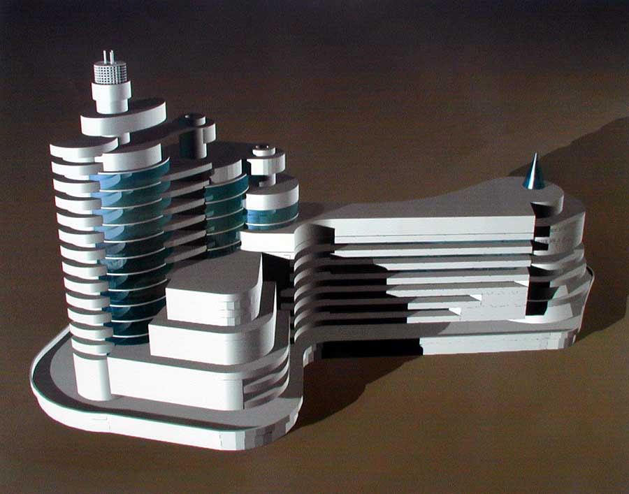 На отведенном участке площадью 1, 2 га площадь террасной застройки покрывает 9650 кв. м. Стилобат используется для паркинга. Один объём занимает гостиница, ресторан и казино. Во втором объёме размещаются офисы. Авторы старались органично вписать здание в склон.