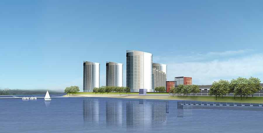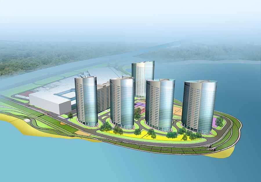 Встроенное изображение комплекса жилых зданий в панораме города. |