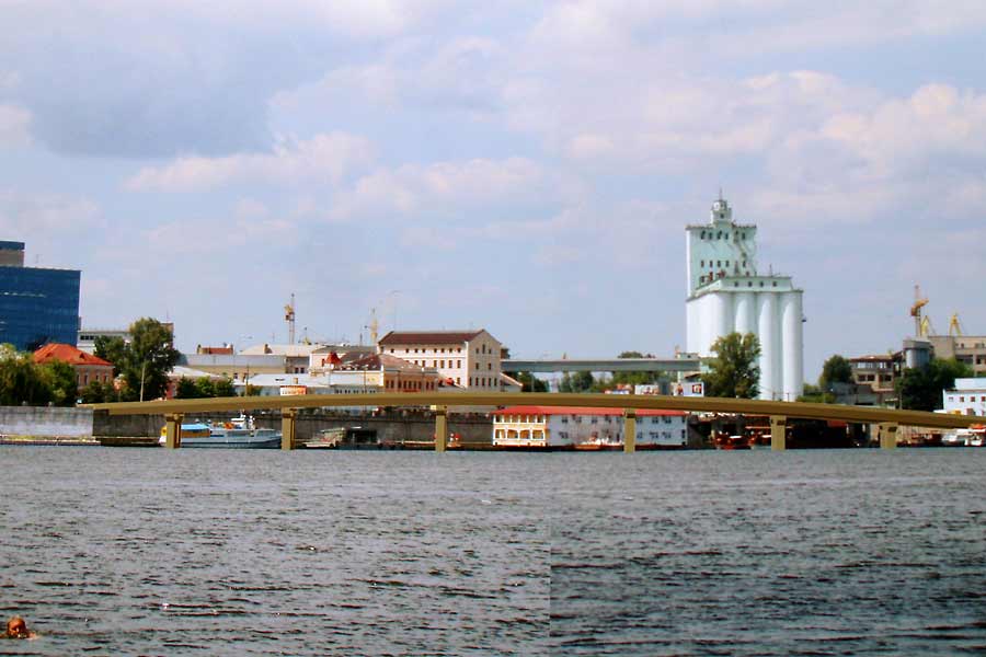 Архитектор Хорхот предложил свой вариант решения проблемы, суть которого заключается в следующем: расположить над гладью Днепра, на уровне существующей набережной, эстакаду в виде консоли, которая увеличит пропускную способность трассы, не закроет архитектуру Подола, и исключит необходимость строительства дорогостоящего тоннеля. Эту идею поддержал архитектор Виг.