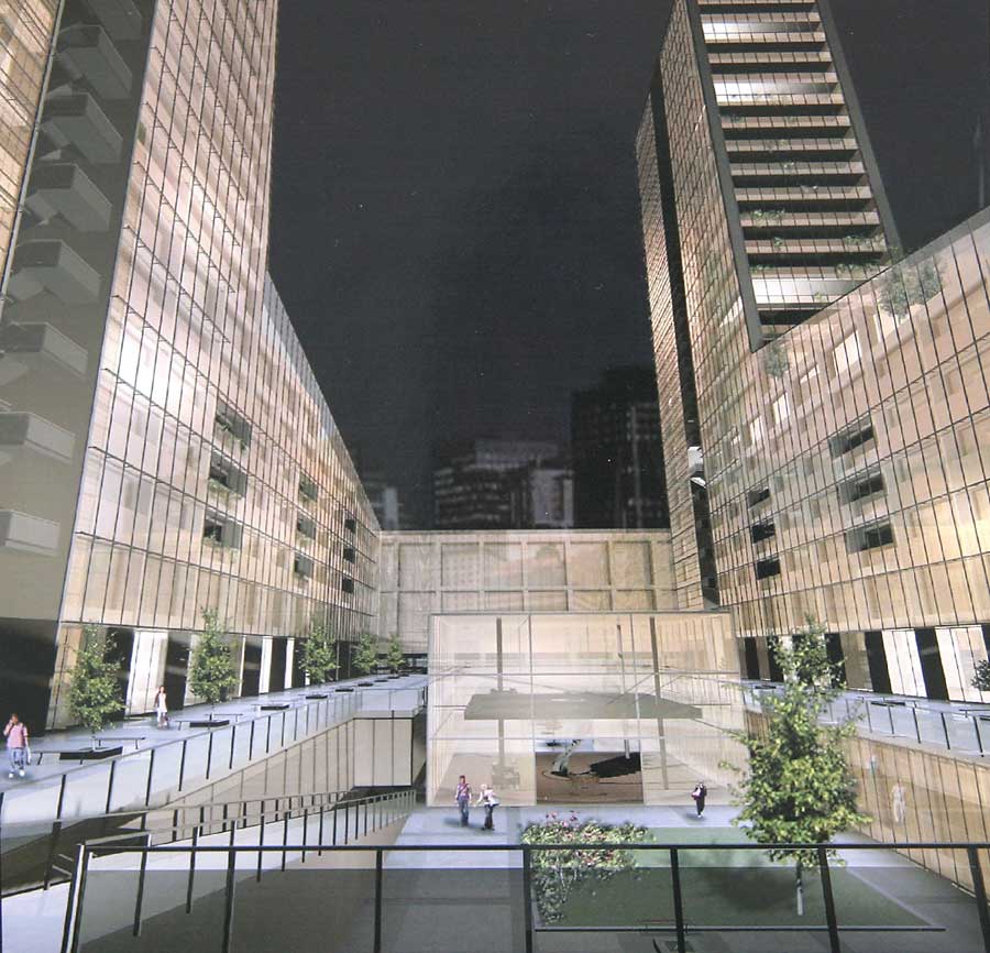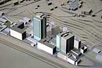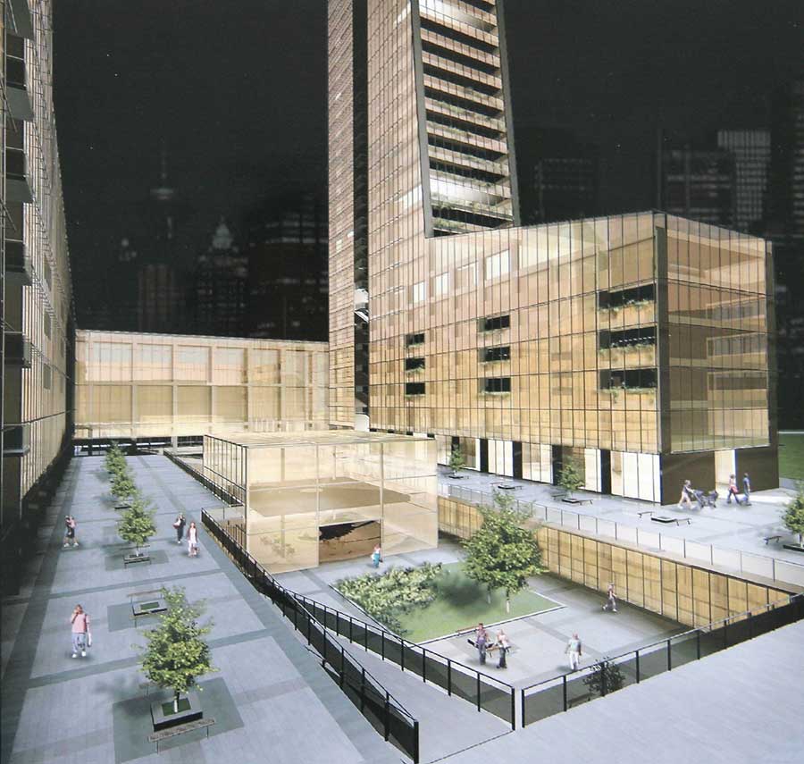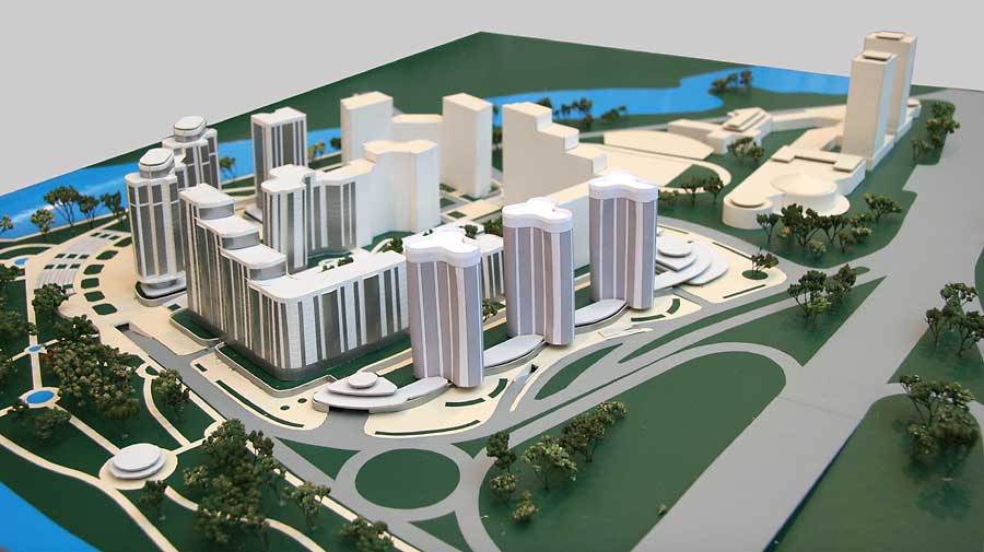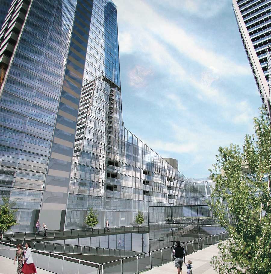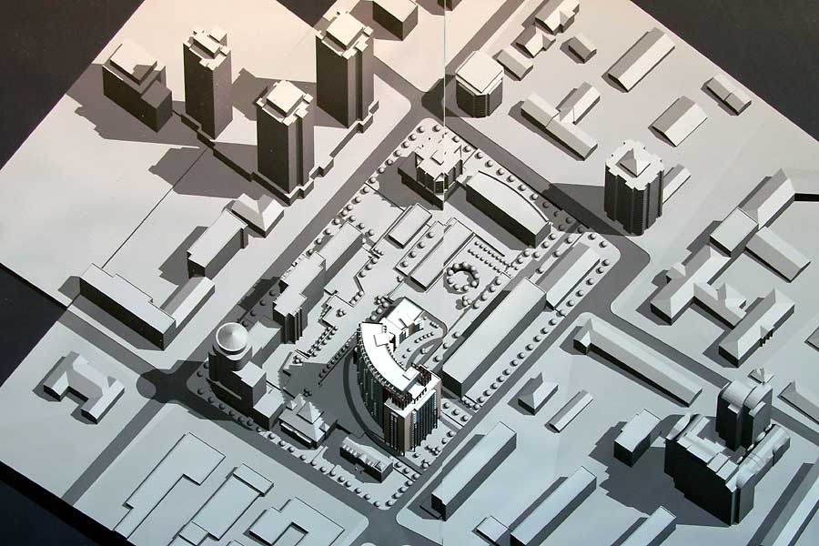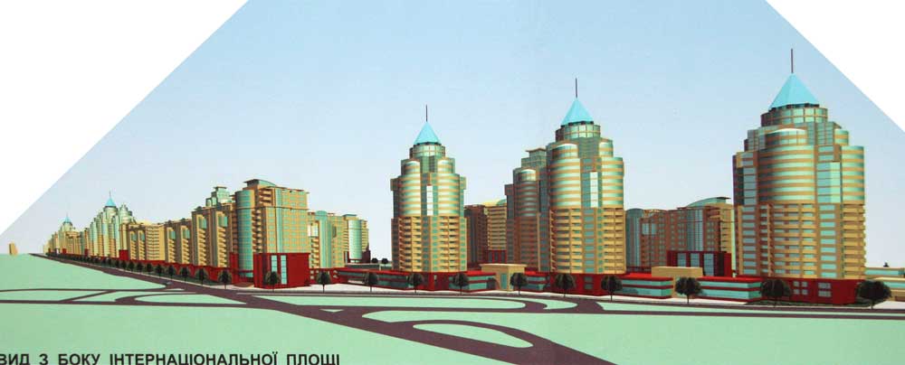 Все здания комплекса устанавливаются, на имеющий значительные размеры стилобат, в котором разместятся паркинги и торговые помещения.