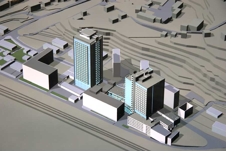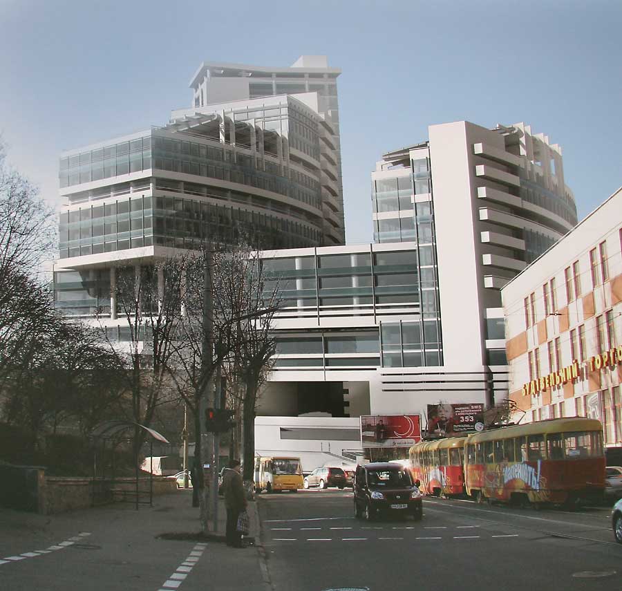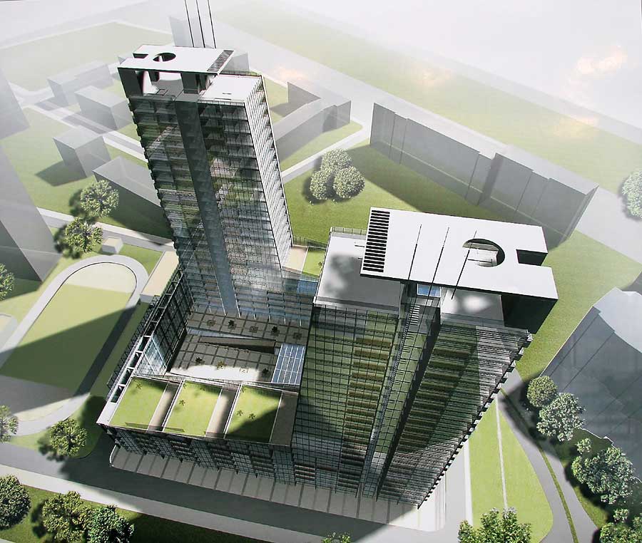 Офисный центр предполагается построить на участке площадью 0,495га. В состав комплекса входят: 14-19-ти этажное офисное здание со встроенно-пристроенными паркингом и торговыми помещениями, 24-х этажное офисное здание, открытая площадка для временного хранения 48-ми автомобилей.