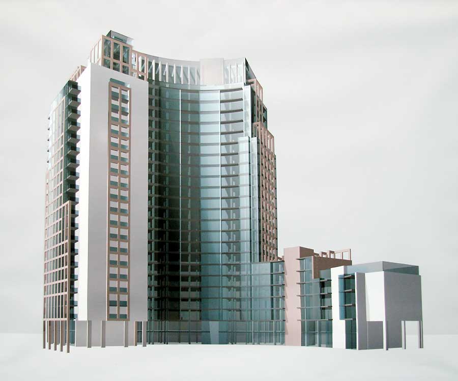 25-ти этажное здание, два верхних этажа которого, отводятся под размещение творческих мастерских, имеет 202 квартиры и будет сооружено на участке площадью 0,55га.