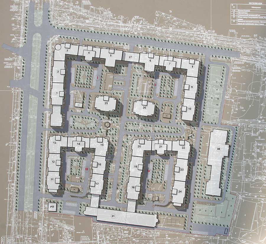 Все здания устанавливаются на стилобате, под которым устраиваются многоуровневые подземные паркинги, рассчитанные на хранение 850-860-ти автомобилей. Общее количество квартир комплекса - 1640.