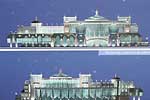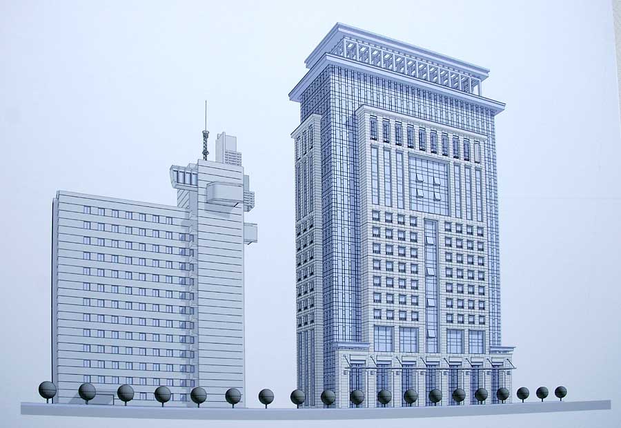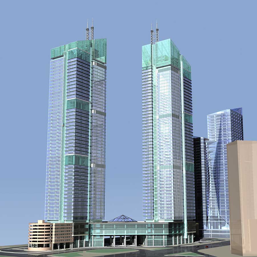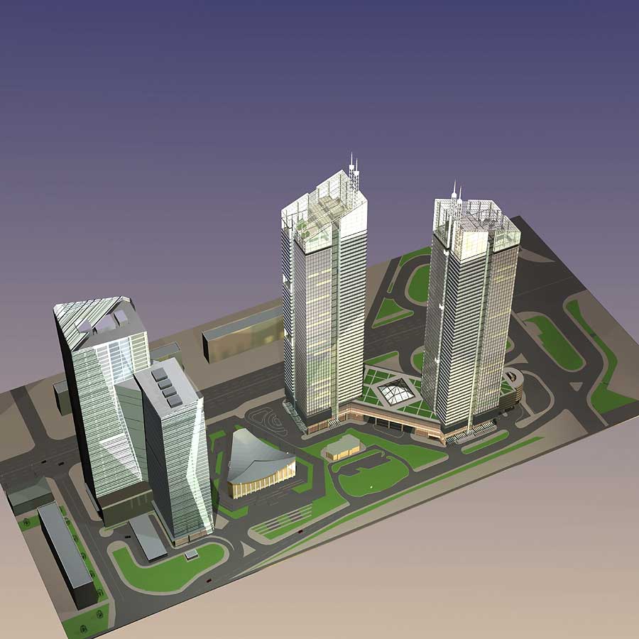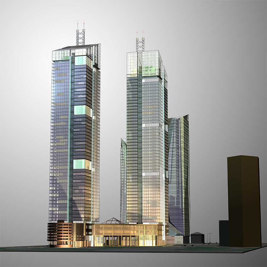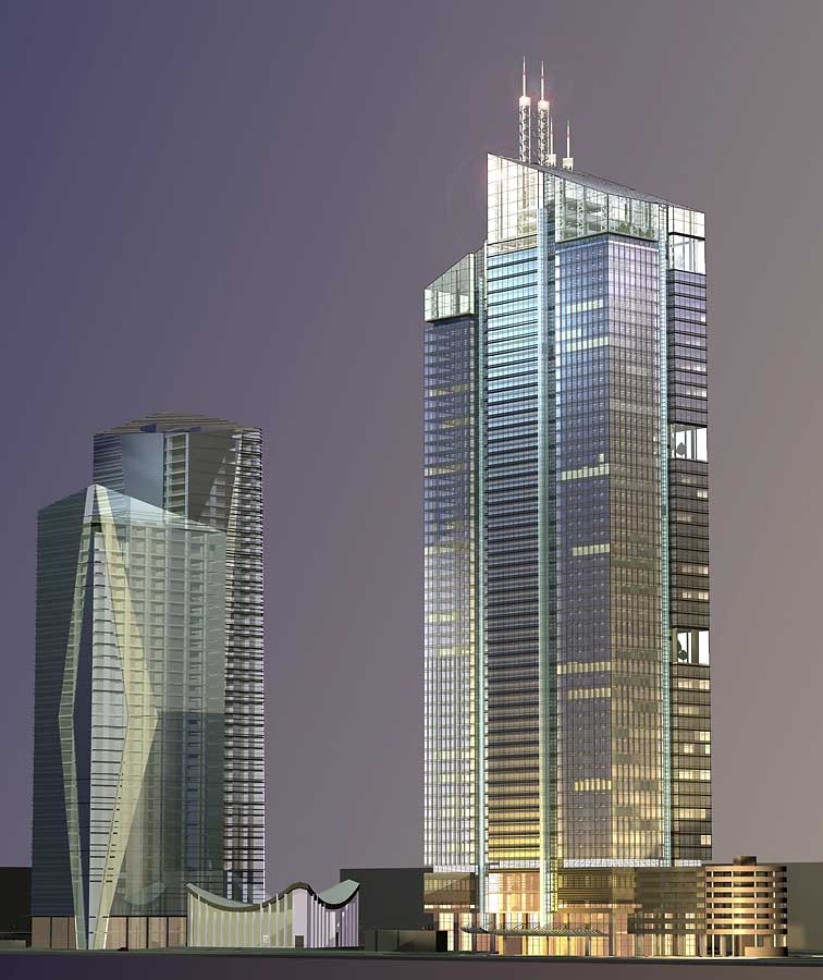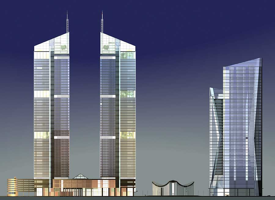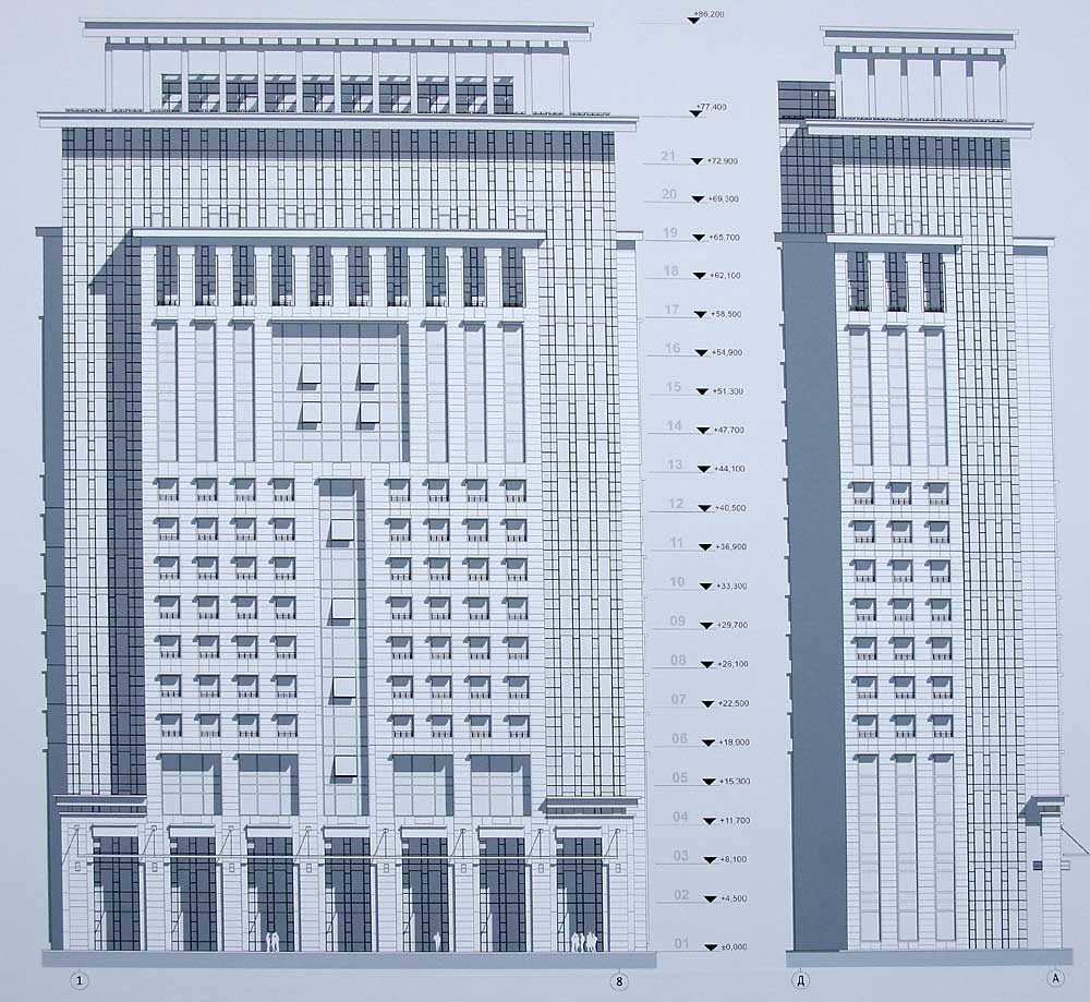 Запроектированный комплекс, как и в предыдущем варианте, состоит из двух установленных на стилобате высотных блоков, которые имеют несколько иную архитектуру.