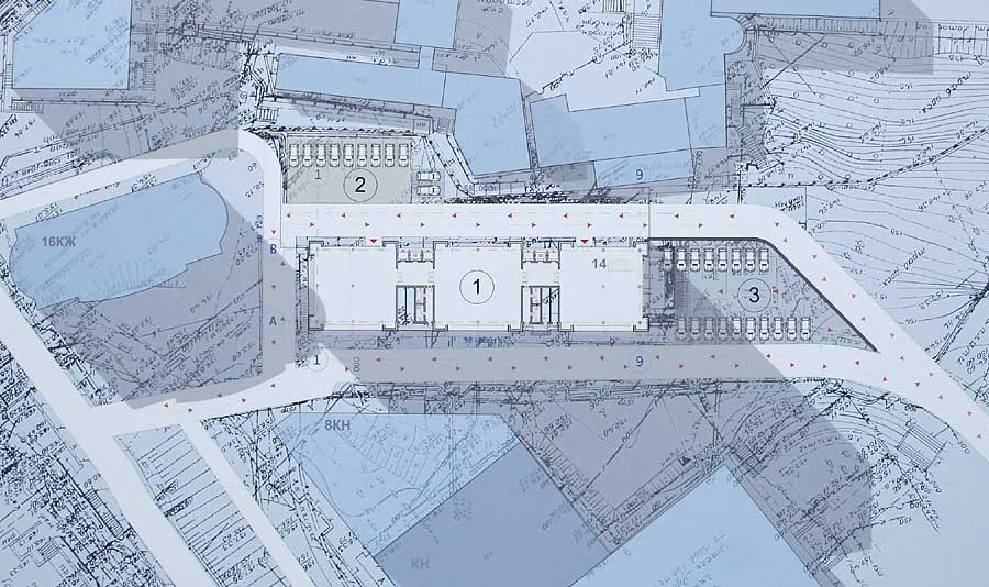 Под комплексом размещается подземный паркинг кассетного типа для 240 автомобилей.