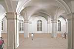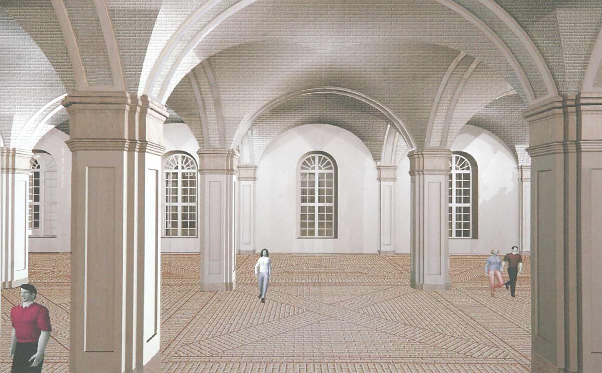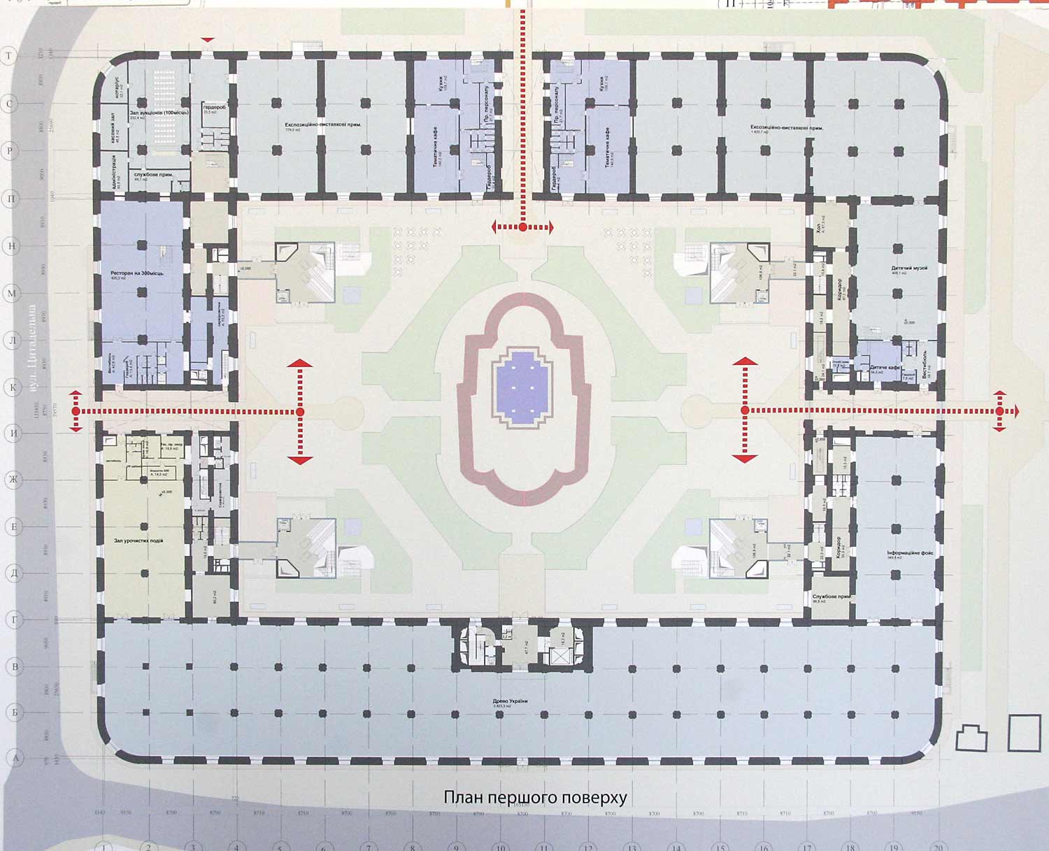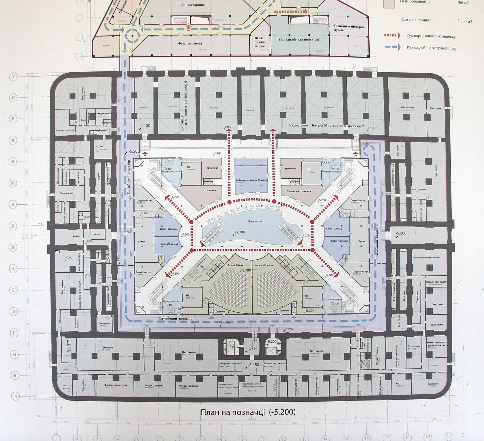 Организация входа в утверждённом варианте проекта реконструкции предусматривала установку лифтов внутри здания. В этом варианте частично разрушались существующие своды что, по мнению архитектора Андрея Миргородского является недопустимым.